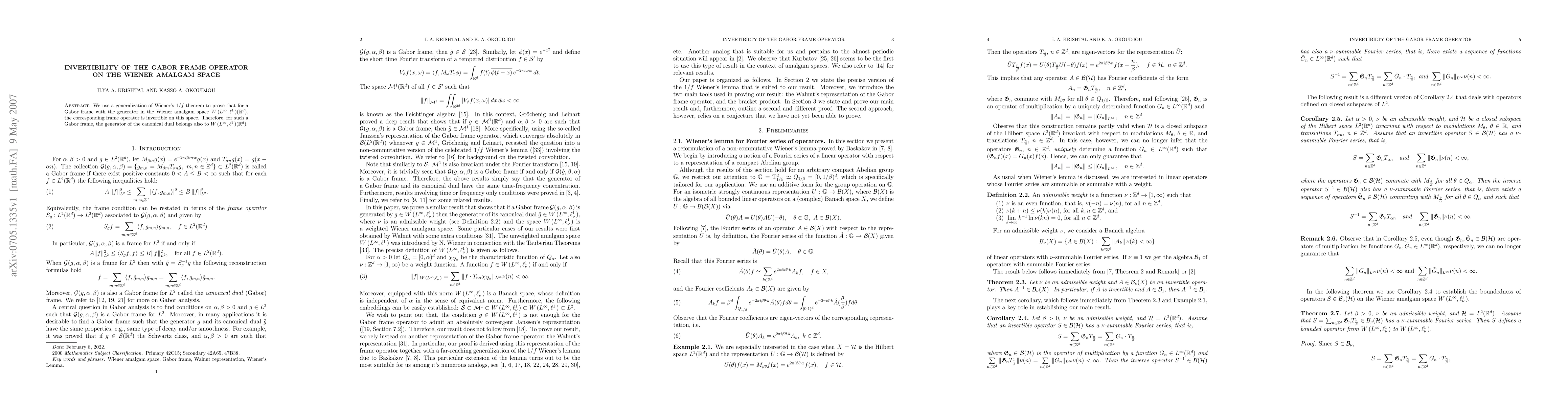 This paper proves the invertibility of the Gabor frame operator for generators in the Wiener amalgam space $W(L^{\infty}, \ell^{1}_{\nu})(\mathbb{R}^{d})$, leveraging a generalized Wiener's $1/f$ theorem. Consequently, the generator of the canonical dual frame also resides in this space.