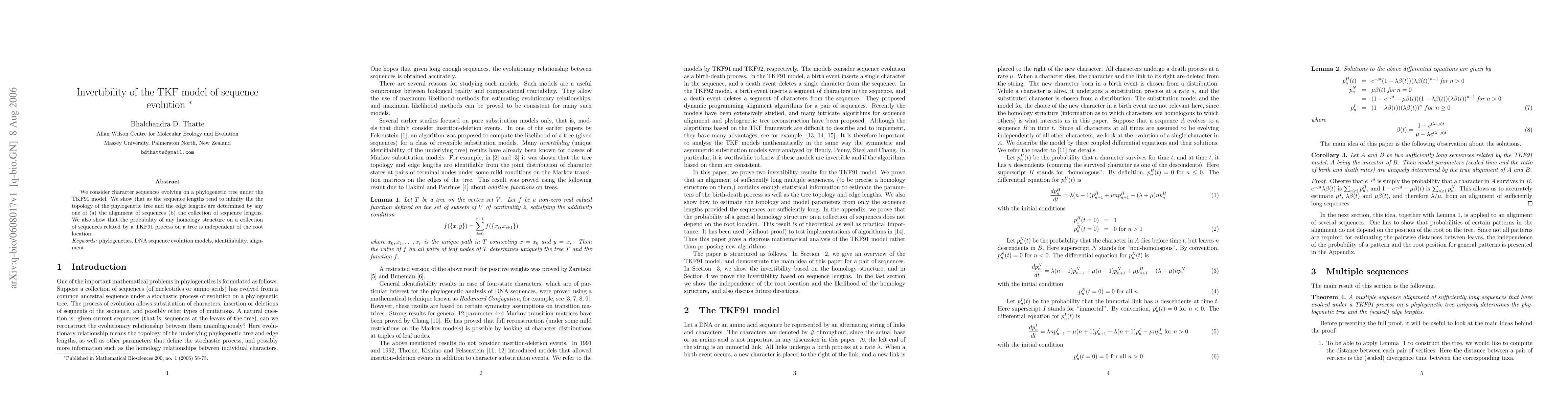 We consider character sequences evolving on a phylogenetic tree under the TKF91 model. We show that as the sequence lengths tend to infinity the the topology of the phylogenetic tree and the edge lengths are determined by any one of (a) the alignment of sequences (b) the collection of sequence lengths. We also show that the probability of any homology structure on a collection of sequences related by a TKF91 process on a tree is independent of the root location. Keywords: phylogenetics, DNA sequence evolution models, identifiability, alignment