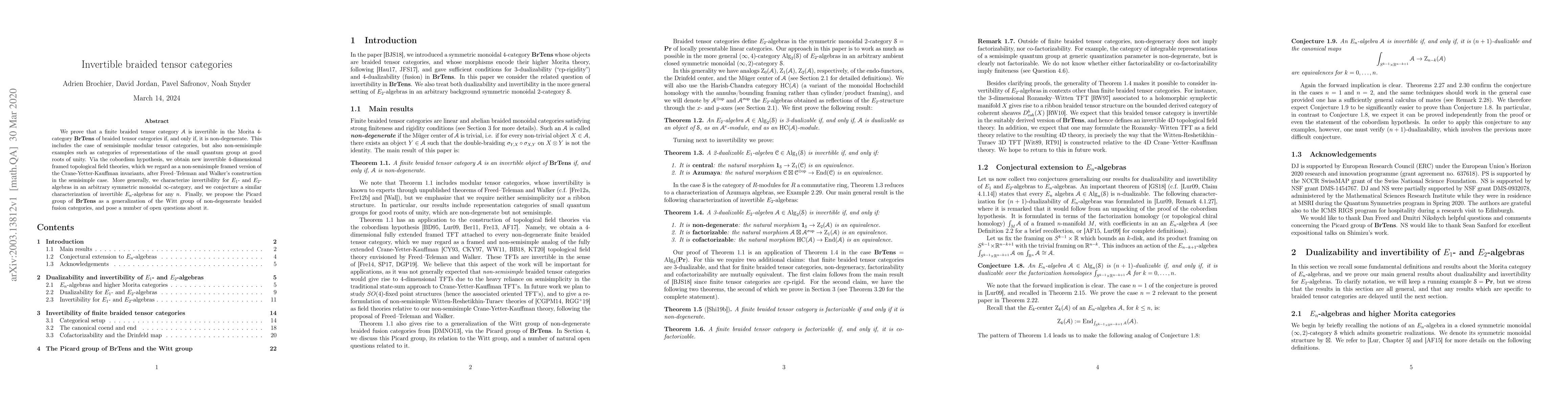This paper proves that a finite braided tensor category is invertible if and only if it is non-degenerate, leading to new framed topological field theories. It also discusses the characterization of invertibility for E_1- and E_2-algebras in symmetric monoidal oo-categories and proposes the Picard group of BrTens as a generalization of the Witt group.