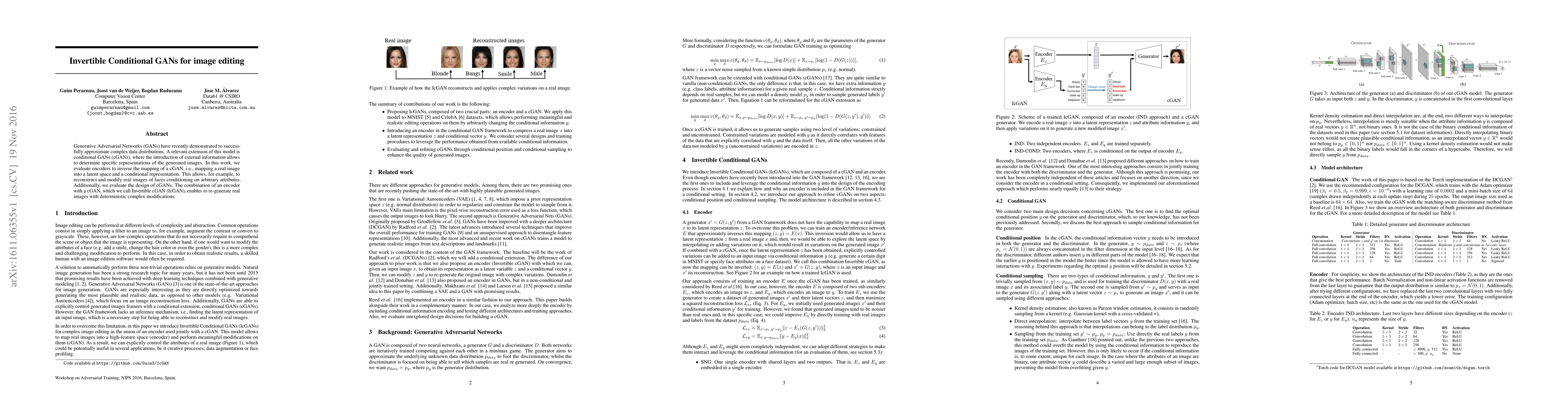 Generative Adversarial Networks (GANs) have recently demonstrated to successfully approximate complex data distributions. A relevant extension of this model is conditional GANs (cGANs), where the introduction of external information allows to determine specific representations of the generated images. In this work, we evaluate encoders to inverse the mapping of a cGAN, i.e., mapping a real image into a latent space and a conditional representation. This allows, for example, to reconstruct and modify real images of faces conditioning on arbitrary attributes. Additionally, we evaluate the design of cGANs. The combination of an encoder with a cGAN, which we call Invertible cGAN (IcGAN), enables to re-generate real images with deterministic complex modifications.