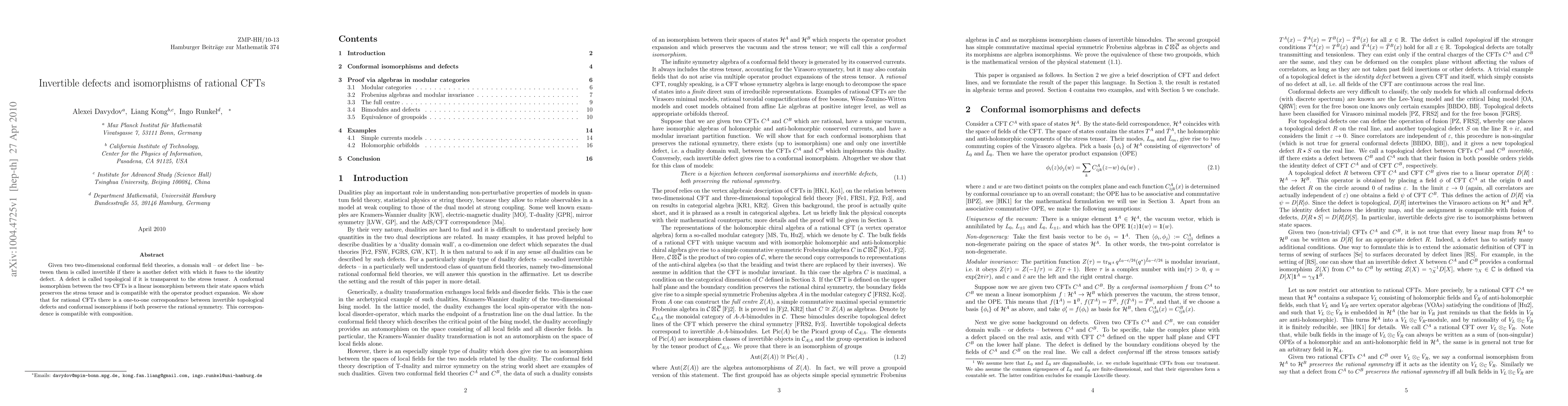 Given two two-dimensional conformal field theories, a domain wall -- or defect line -- between them is called invertible if there is another defect with which it fuses to the identity defect. A defect is called topological if it is transparent to the stress tensor. A conformal isomorphism between the two CFTs is a linear isomorphism between their state spaces which preserves the stress tensor and is compatible with the operator product expansion. We show that for rational CFTs there is a one-to-one correspondence between invertible topological defects and conformal isomorphisms if both preserve the rational symmetry. This correspondence is compatible with composition.