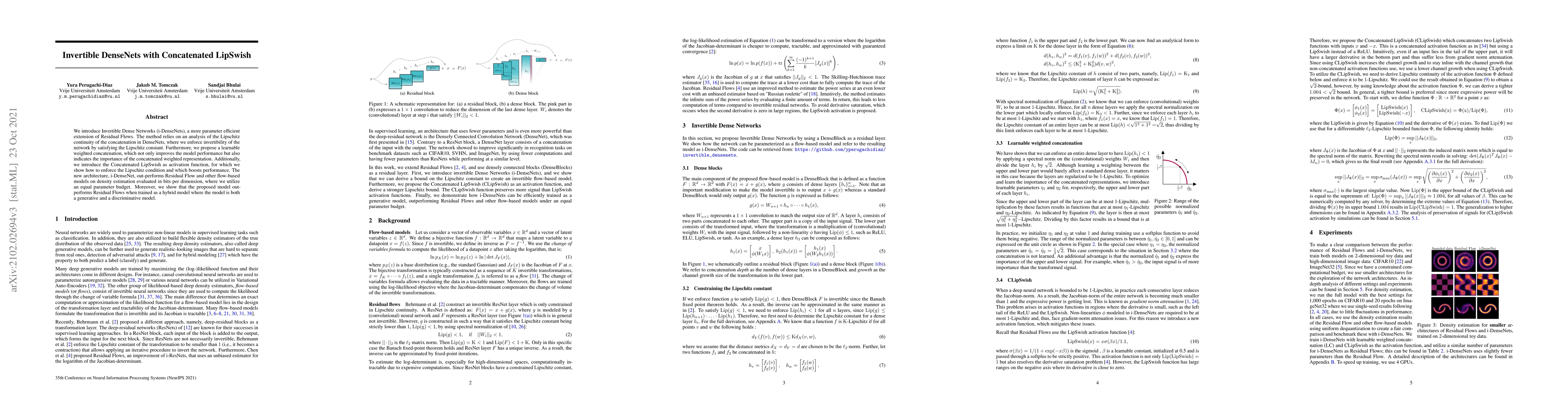 This paper introduces Invertible Dense Networks (i-DenseNets), a parameter-efficient extension of Residual Flows, which enforces invertibility through Lipschitz continuity. The method employs a learnable weighted concatenation and the Concatenated LipSwish activation function, enhancing performance and density estimation.