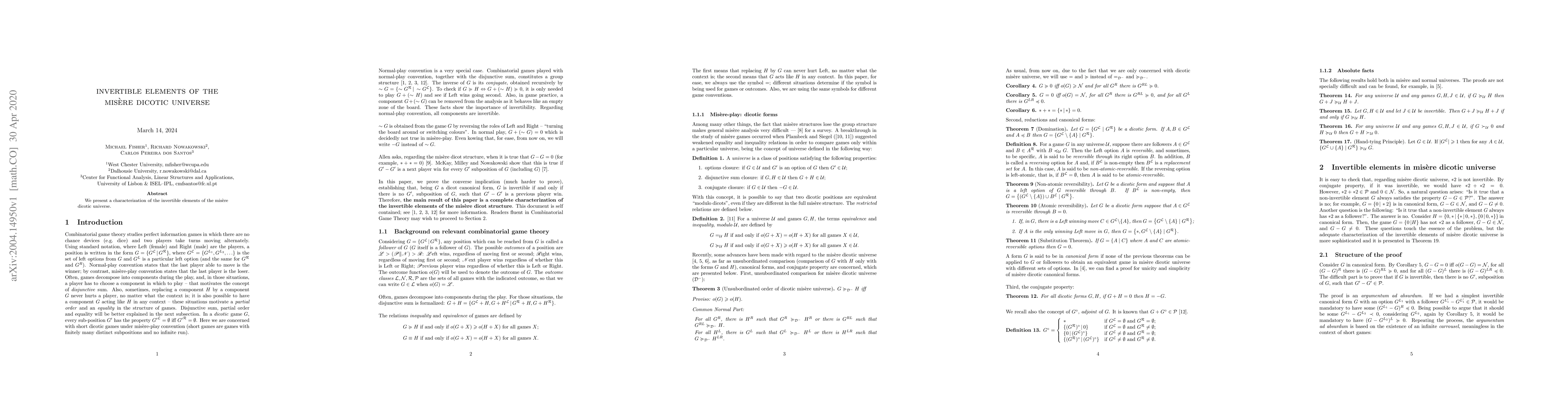 We present a characterization of the invertible elements of the misere dicotic universe.