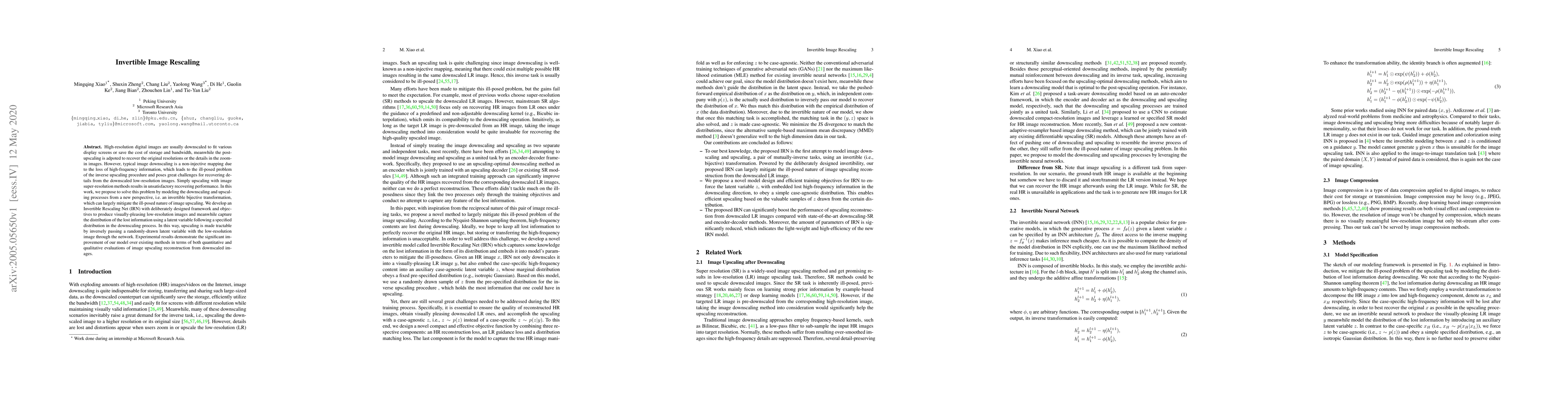 This paper proposes an Invertible Rescaling Net (IRN) to address the challenge of recovering high-resolution details from downscaled images by modeling the downscaling and upscaling as an invertible transformation. The IRN captures lost information using a latent variable, enabling effective and visually-pleasing image upscaling.
