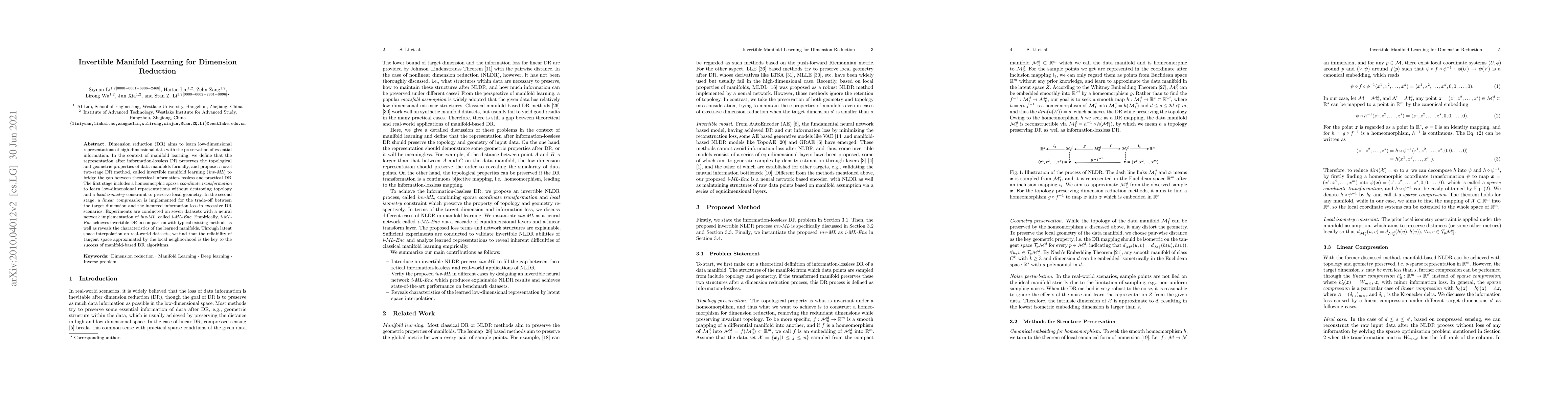 This paper proposes a novel invertible manifold learning (inv-ML) method for dimension reduction that preserves topological and geometric properties of data manifolds. The method involves a two-stage process: a homeomorphic sparse coordinate transformation and a local isometry constraint, followed by linear compression to balance dimension reduction and information loss.