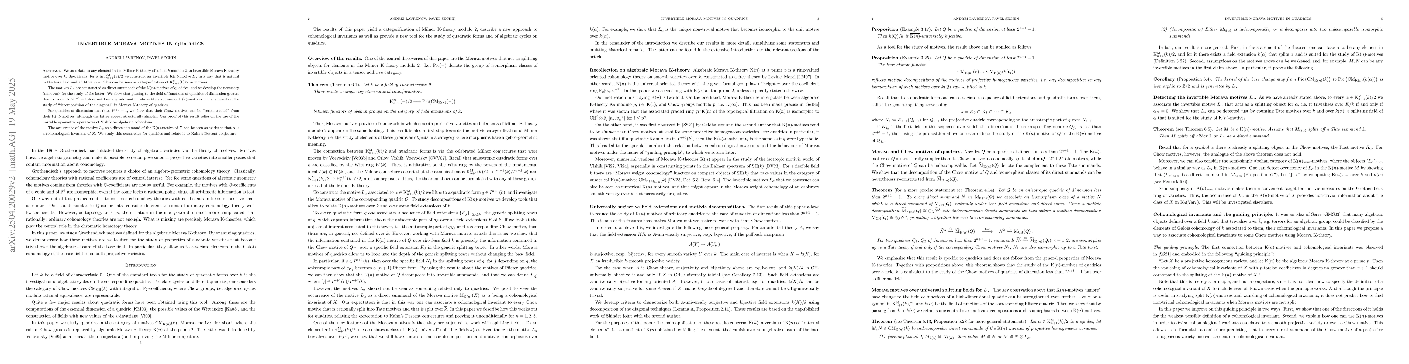 The paper constructs invertible Morava K-theory motives over a field k using elements in Milnor K-theory modulo 2, associating them naturally to the base field and additively to α. It also develops a framework for studying K(n)-motives of quadrics and uses unstable symmetric operations of Vishik on algebraic cobordism.
