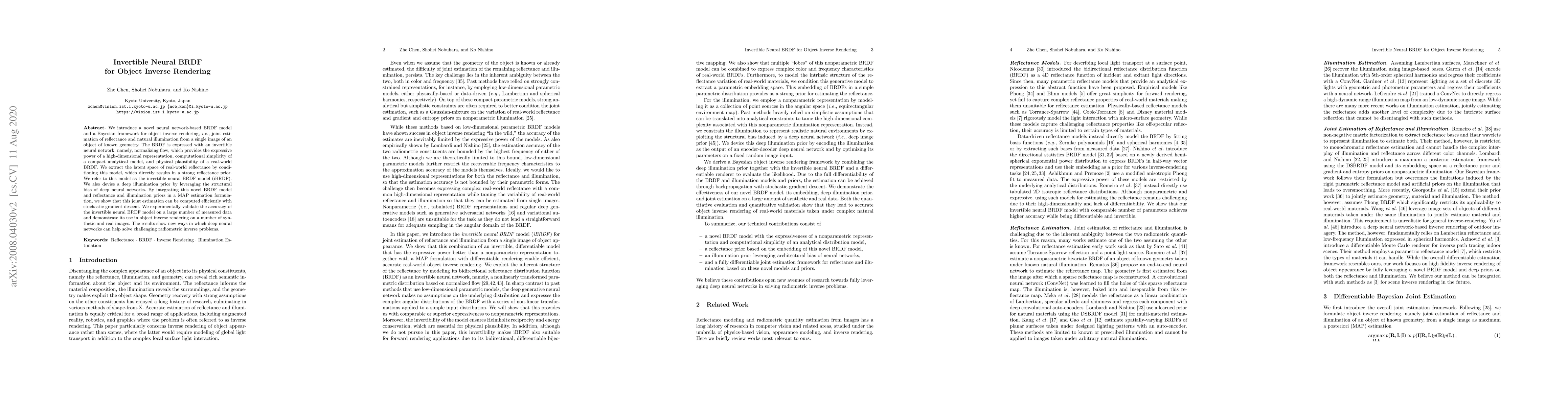 This paper introduces an invertible neural BRDF model using normalizing flows for object inverse rendering, enabling joint estimation of reflectance and illumination from a single image. The model integrates deep reflectance and illumination priors within a MAP estimation framework for efficient computation.