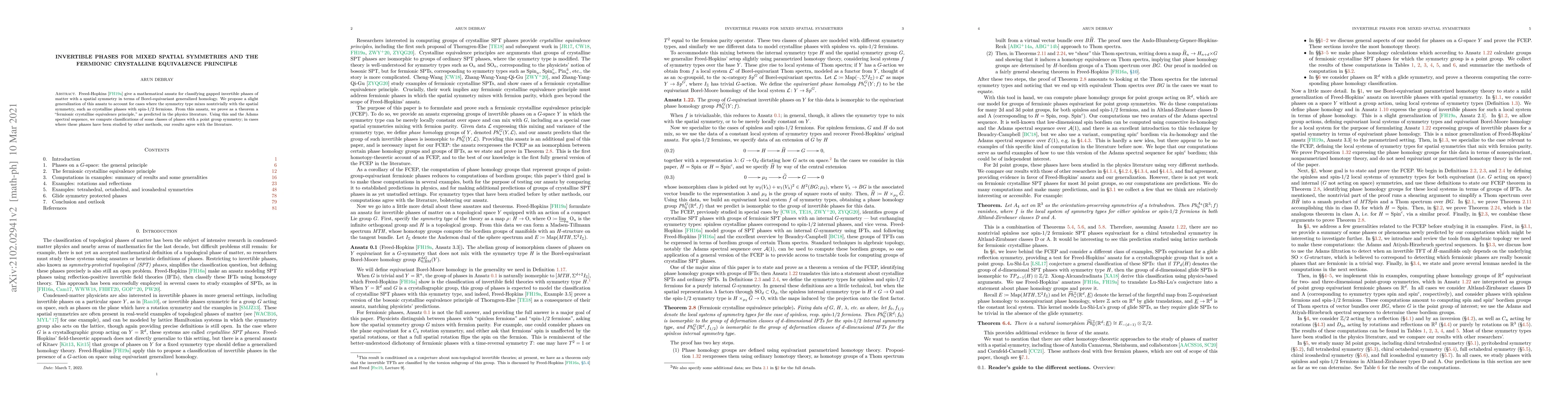 Freed-Hopkins give a mathematical ansatz for classifying gapped invertible phases of matter with a spatial symmetry in terms of Borel-equivariant generalized homology. We propose a slight generalization of this ansatz to account for cases where the symmetry type mixes nontrivially with the spatial symmetry, such as crystalline phases with spin-1/2 fermions. From this ansatz, we prove as a theorem a "fermionic crystalline equivalence principle," as predicted in the physics literature. Using this and the Adams spectral sequence, we compute classifications of some classes of phases with a point group symmetry; in cases where these phases have been studied by other methods, our results agree with the literature.