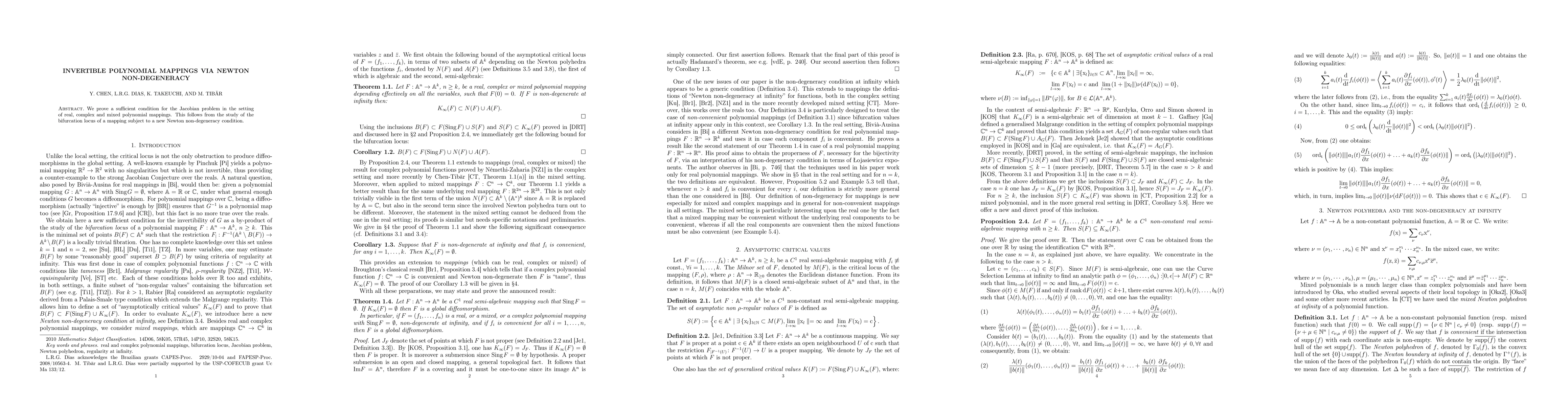 We prove a sufficient condition for the Jacobian problem in the setting of real, complex and mixed polynomial mappings. This follows from the study of the bifurcation locus of a mapping subject to a new Newton non-degeneracy condition.