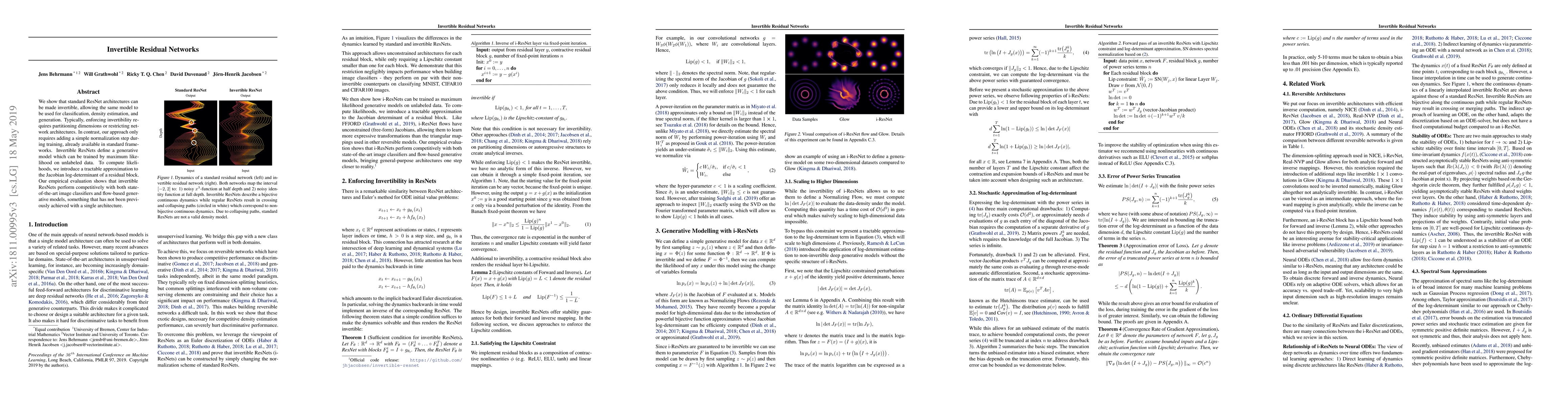 Invertible Residual Networks enable the same model to serve for classification, density estimation, and generation by adding a simple normalization step during training. This approach achieves competitive performance with state-of-the-art image classifiers and generative models without requiring dimension partitioning or architectural restrictions.