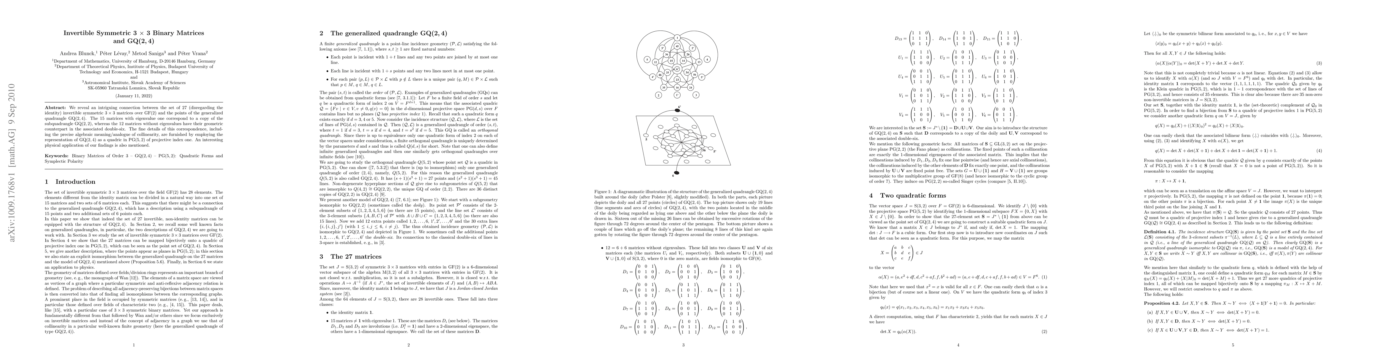 This paper establishes a connection between invertible symmetric 3 x 3 binary matrices and the generalized quadrangle GQ(2,4), showing that 15 matrices correspond to GQ(2,2) and 12 others relate to a double-six, with implications for physical applications.