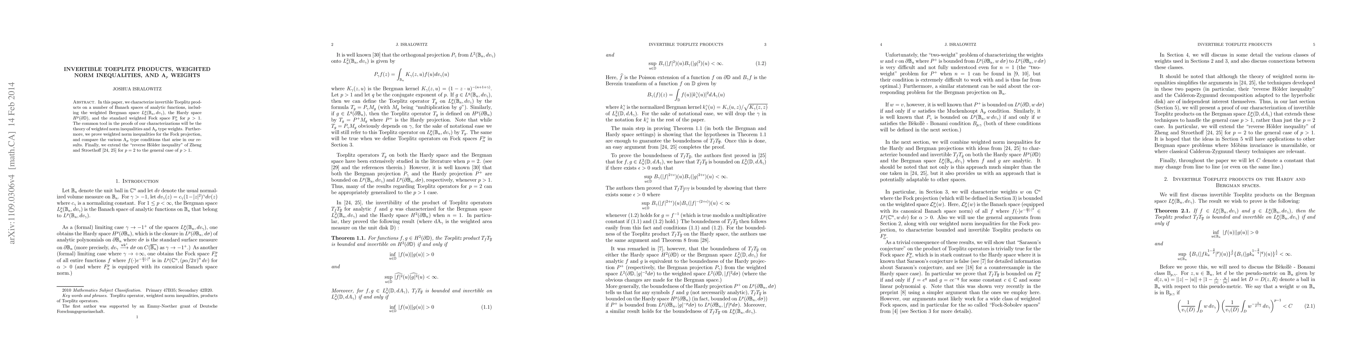 This paper characterizes invertible Toeplitz products on spaces of analytic functions, including weighted Bergman space, Hardy space, and Fock space, using weighted norm inequalities and A_p weights, with implications for reverse Holder inequality.