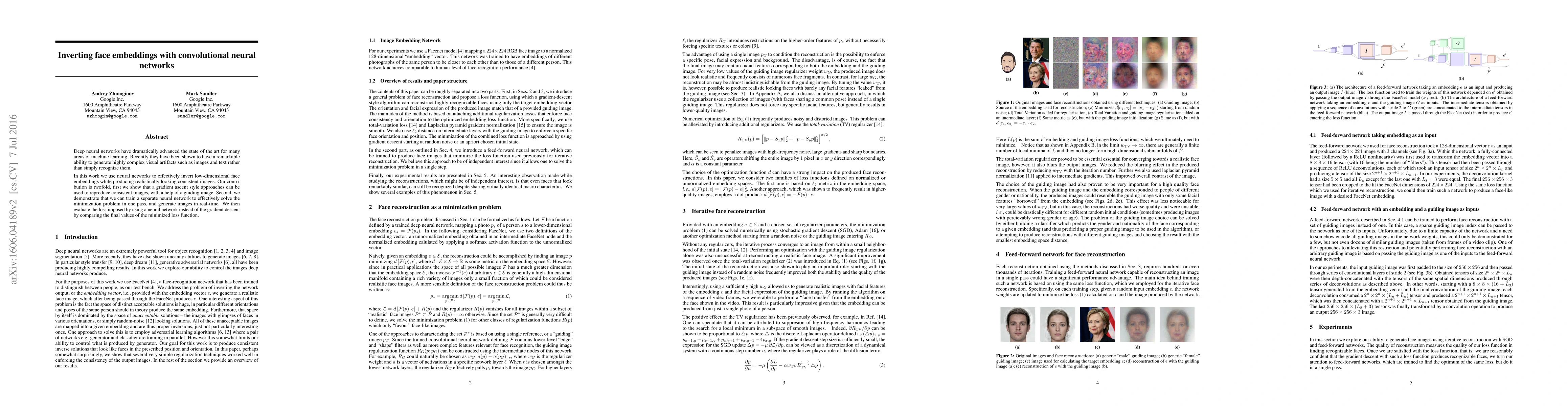 Deep neural networks have dramatically advanced the state of the art for many areas of machine learning. Recently they have been shown to have a remarkable ability to generate highly complex visual artifacts such as images and text rather than simply recognize them. In this work we use neural networks to effectively invert low-dimensional face embeddings while producing realistically looking consistent images. Our contribution is twofold, first we show that a gradient ascent style approaches can be used to reproduce consistent images, with a help of a guiding image. Second, we demonstrate that we can train a separate neural network to effectively solve the minimization problem in one pass, and generate images in real-time. We then evaluate the loss imposed by using a neural network instead of the gradient descent by comparing the final values of the minimized loss function.
