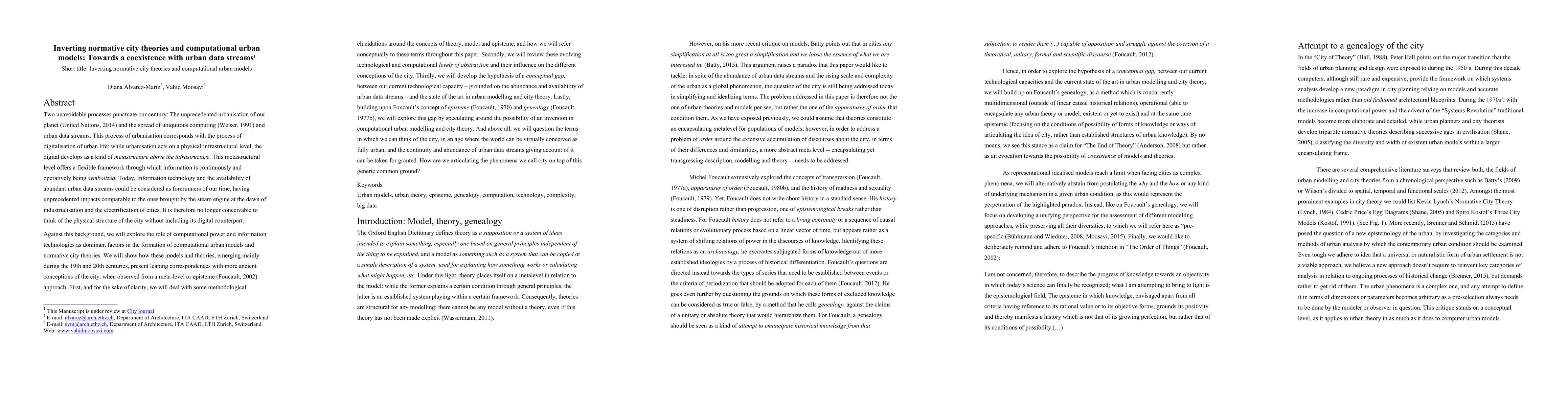 Two unavoidable processes punctuate our century: The unprecedented urbanisation of our planet (United Nations, 2014) and the spread of ubiquitous computing (Weiser, 1991) and urban data streams. This process of urbanisation corresponds with the process of digitalisation of urban life: while urbanisation acts on a physical infrastructural level, the digital develops as a kind of metastructure above the infrastructure. This metastructural level offers a flexible framework through which information is continuously and operatively being symbolized. Today, Information technology and the availability of abundant urban data streams could be considered as forerunners of our time, having unprecedented impacts comparable to the ones brought by the steam engine at the dawn of industrialisation and the electrification of cities. It is therefore no longer conceivable to think of the physical structure of the city without including its digital counterpart. Against this background, we will explore the role of computational power and information technologies as dominant factors in the formation of computational urban models and normative city theories. We will show how these models and theories, emerging mainly during the 19th and 20th centuries, present leaping correspondences with more ancient conceptions of the city, when observed from a meta-level or episteme (Foucault, 2002) approach. First, and for the sake of clarity, we will deal with some methodological elucidations around the concepts of theory, model and episteme, and how we will refer conceptually to these terms throughout this paper. Secondly, we will review these evolving technological and computational levels of abstraction and their influence on the different conceptions of the city. Thirdly, we will develop the hypothesis of a conceptual gap, between our current technological capacity -- grounded on the abundance and availability of urban data streams -- and the state of the art in urban modelling and city theory. Lastly, building upon Foucault's concept of episteme (Foucault, 1970) and genealogy (Foucault, 1977b), we will explore this gap by speculating around the possibility of an inversion in computational urban modelling and city theory. And above all, we will question the terms in which we can think of the city, in an age where the world can be virtually conceived as fully urban, and the continuity and abundance of urban data streams giving account of it can be taken for granted. How are we articulating the phenomena we call city on top of this generic common ground?