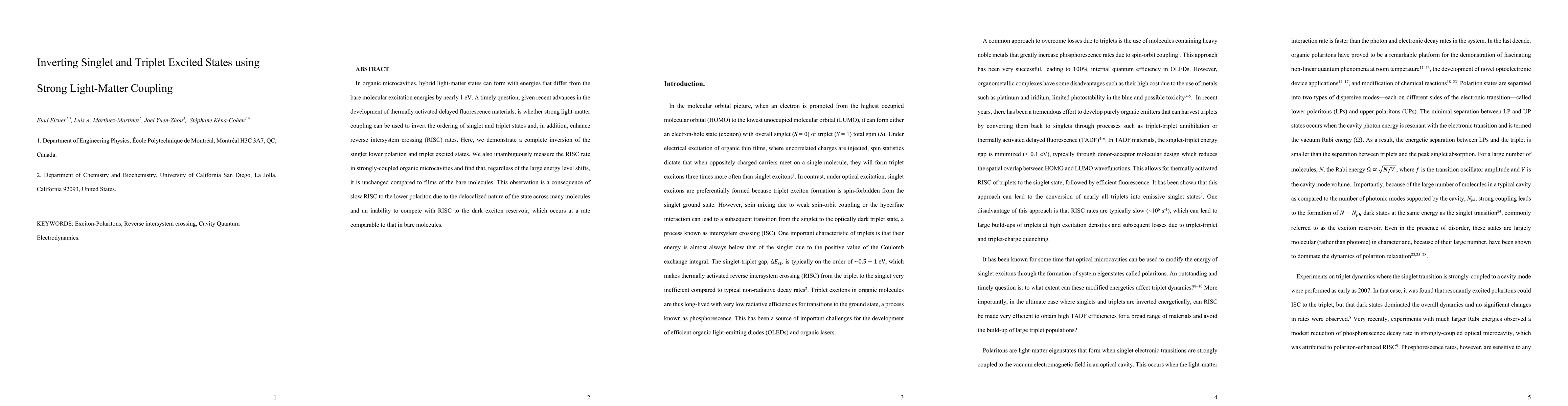 This paper demonstrates the inversion of singlet and triplet excited states in organic microcavities through strong light-matter coupling, achieving a complete reversal of their energy ordering. Despite significant energy shifts, the study finds that the reverse intersystem crossing rate remains unchanged, attributed to the delocalized nature of the coupled states and competition with RISC to a dark exciton reservoir.
