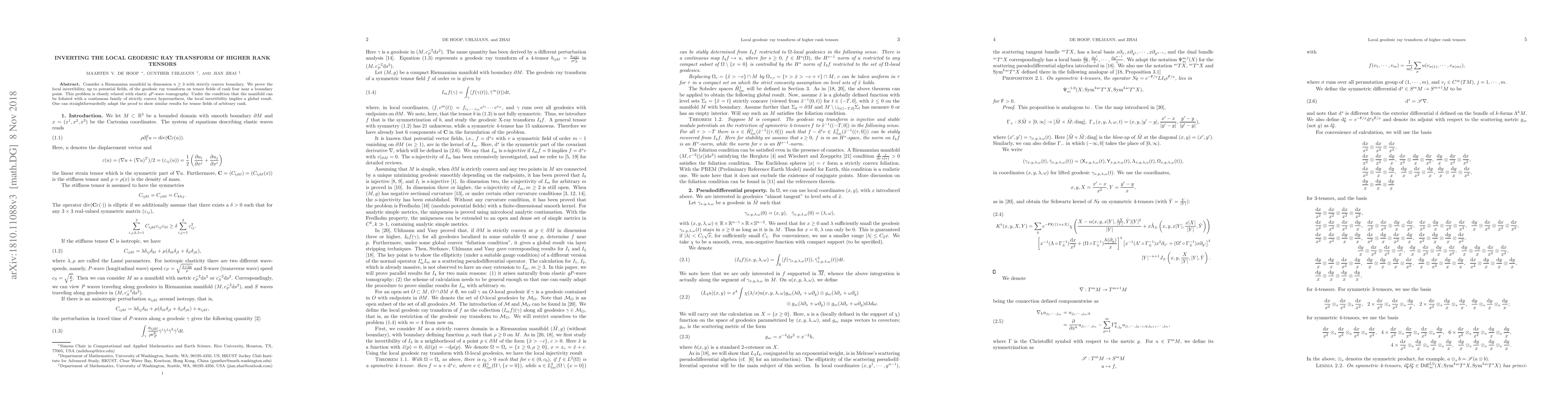 This paper proves the local invertibility of the geodesic ray transform for tensor fields of rank four near the boundary of a strictly convex Riemannian manifold, with implications for elastic \textit{qP}-wave tomography. The method can be extended to tensor fields of any rank under suitable foliation conditions.