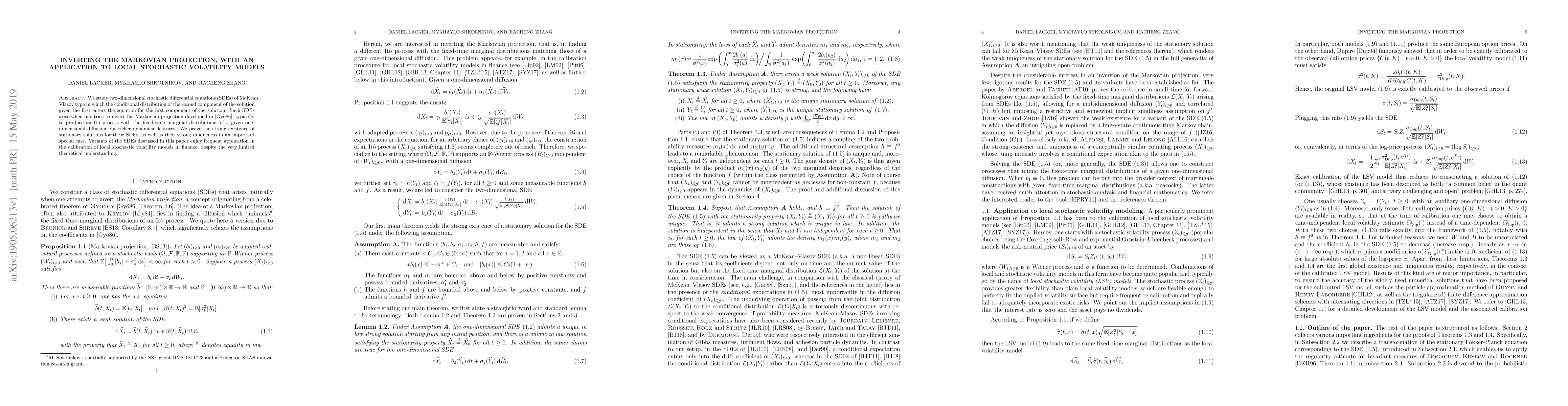 Researchers study two-dimensional stochastic differential equations that invert Markovian projection methods for one-dimensional diffusion models, proving strong existence and uniqueness of stationary solutions with implications for local stochastic volatility modeling in finance.