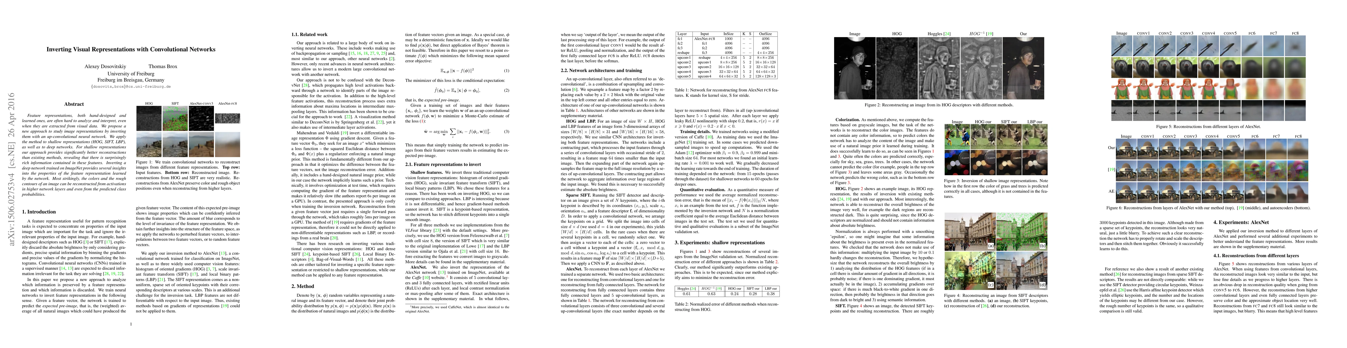 This paper proposes an up-convolutional neural network to invert visual representations, showing better reconstructions for shallow features like HOG and SIFT. It also provides insights into deep network representations, revealing that higher layers can reconstruct colors and contours from activations and class probabilities.