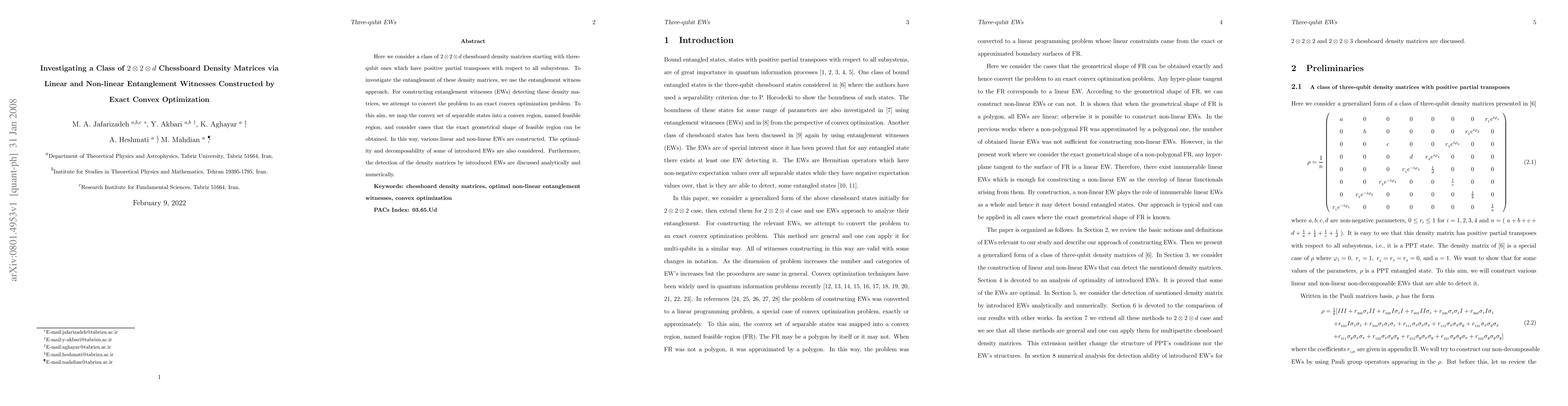 This paper investigates $2\otimes2\otimes d$ chessboard density matrices using entanglement witnesses constructed through exact convex optimization. It explores linear and non-linear entanglement witnesses to detect entanglement in these matrices, discussing their optimality and decomposability.