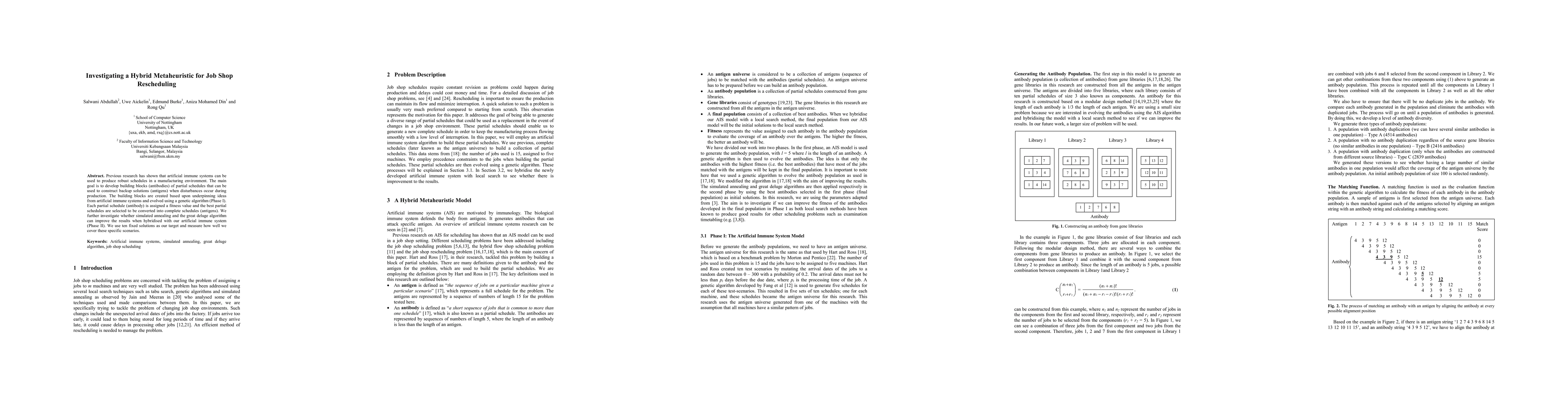 Previous research has shown that artificial immune systems can be used to produce robust schedules in a manufacturing environment. The main goal is to develop building blocks (antibodies) of partial schedules that can be used to construct backup solutions (antigens) when disturbances occur during production. The building blocks are created based upon underpinning ideas from artificial immune systems and evolved using a genetic algorithm (Phase I). Each partial schedule (antibody) is assigned a fitness value and the best partial schedules are selected to be converted into complete schedules (antigens). We further investigate whether simulated annealing and the great deluge algorithm can improve the results when hybridised with our artificial immune system (Phase II). We use ten fixed solutions as our target and measure how well we cover these specific scenarios.
