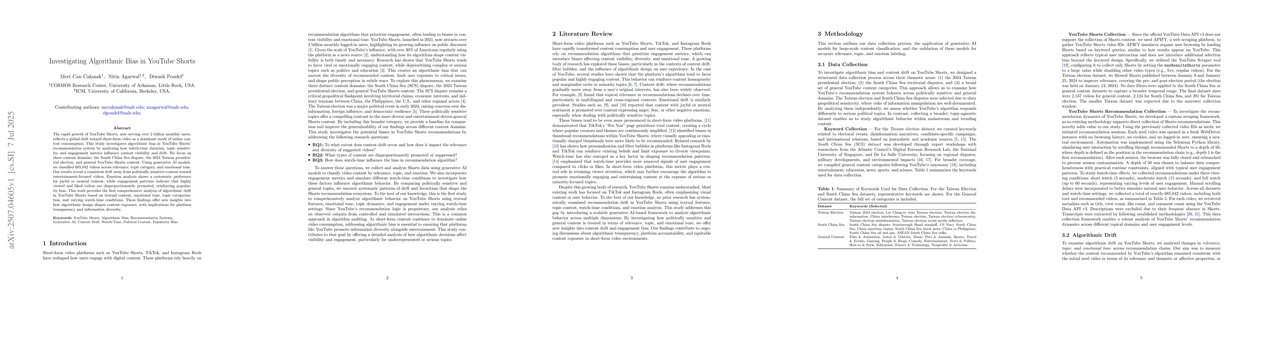 The rapid growth of YouTube Shorts, now serving over 2 billion monthly users, reflects a global shift toward short-form video as a dominant mode of online content consumption. This study investigates algorithmic bias in YouTube Shorts' recommendation system by analyzing how watch-time duration, topic sensitivity, and engagement metrics influence content visibility and drift. We focus on three content domains: the South China Sea dispute, the 2024 Taiwan presidential election, and general YouTube Shorts content. Using generative AI models, we classified 685,842 videos across relevance, topic category, and emotional tone. Our results reveal a consistent drift away from politically sensitive content toward entertainment-focused videos. Emotion analysis shows a systematic preference for joyful or neutral content, while engagement patterns indicate that highly viewed and liked videos are disproportionately promoted, reinforcing popularity bias. This work provides the first comprehensive analysis of algorithmic drift in YouTube Shorts based on textual content, emotional tone, topic categorization, and varying watch-time conditions. These findings offer new insights into how algorithmic design shapes content exposure, with implications for platform transparency and information diversity.