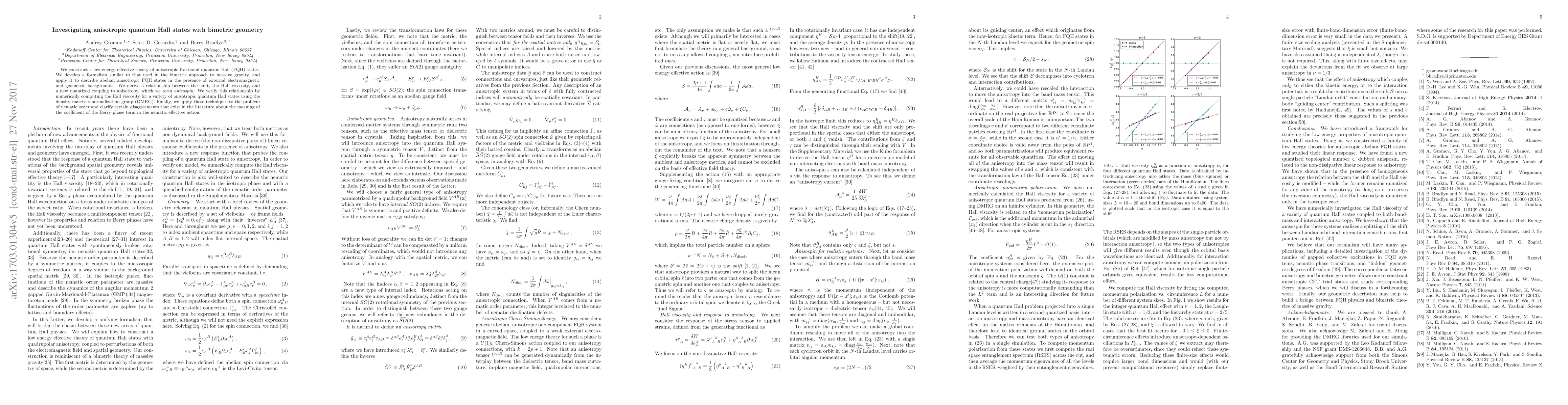 This paper develops a low energy effective theory for anisotropic fractional quantum Hall states using a bi-metric geometry approach, establishing a relationship between Hall viscosity, shift, and a new concept termed "anisospin." Numerical verification of these relationships is achieved via DMRG simulations, and the study resolves discrepancies regarding the Berry phase coefficient in the nematic effective action.