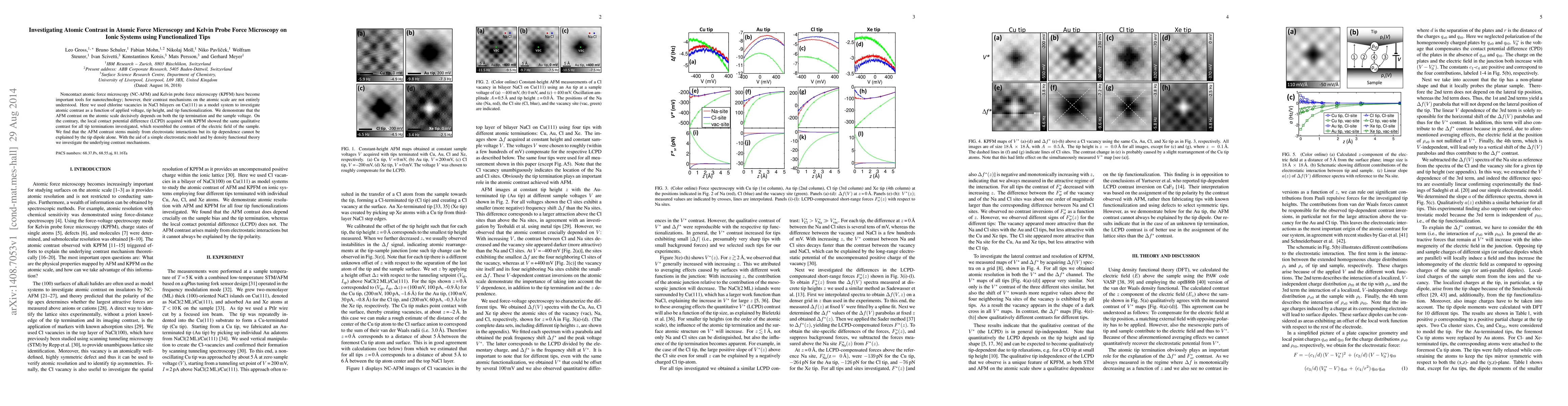 This study investigates atomic contrast mechanisms in NC-AFM and KPFM on ionic systems, finding that NC-AFM contrast depends on tip termination and sample voltage, while KPFM contrast correlates with the sample's electric field. The research concludes that electrostatic interactions play a key role in NC-AFM contrast.