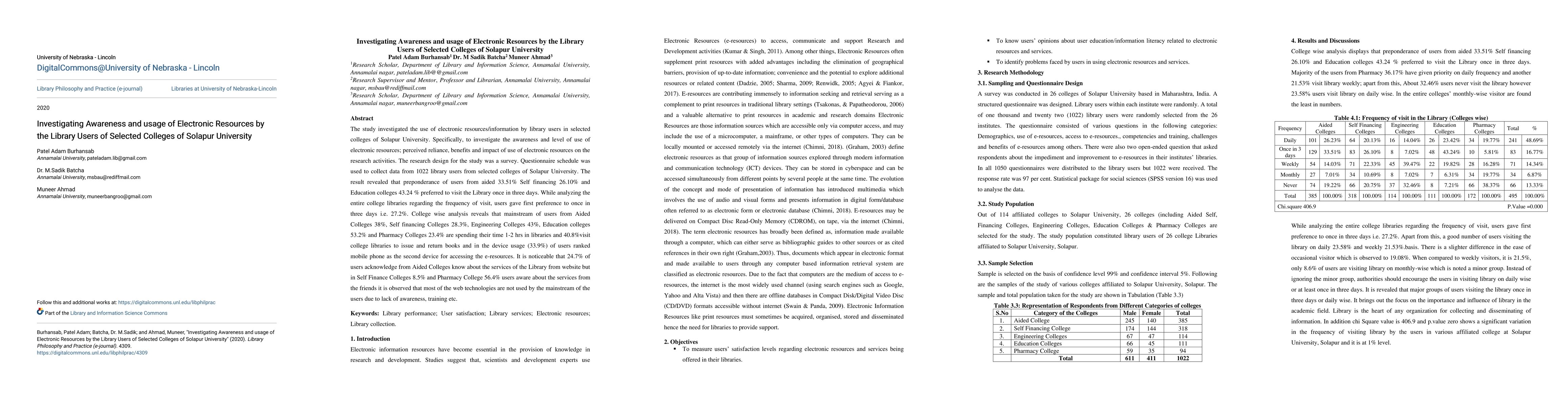 This study surveyed 1022 library users across selected colleges in Solapur University to explore their awareness and use of electronic resources. Findings show varying levels of library visit frequency and device usage for accessing e-resources, with a significant lack of awareness and training impeding full utilization of available web technologies.