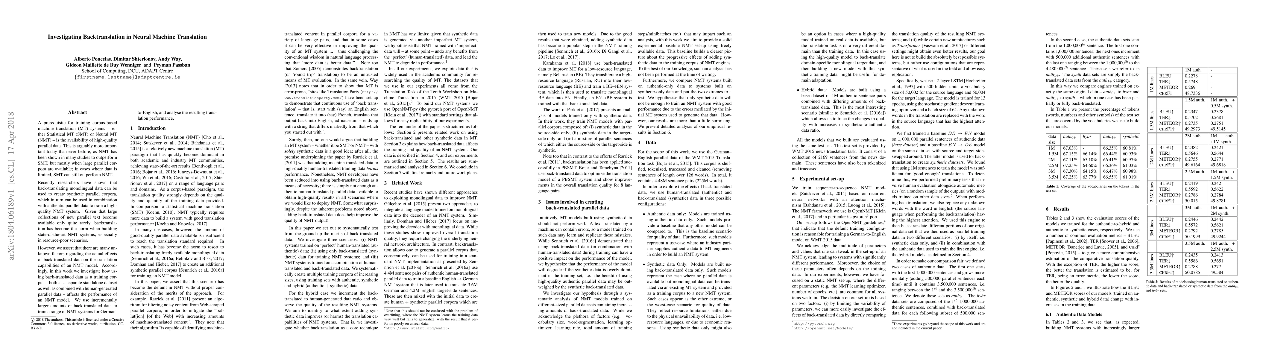 A prerequisite for training corpus-based machine translation (MT) systems -- either Statistical MT (SMT) or Neural MT (NMT) -- is the availability of high-quality parallel data. This is arguably more important today than ever before, as NMT has been shown in many studies to outperform SMT, but mostly when large parallel corpora are available; in cases where data is limited, SMT can still outperform NMT. Recently researchers have shown that back-translating monolingual data can be used to create synthetic parallel corpora, which in turn can be used in combination with authentic parallel data to train a high-quality NMT system. Given that large collections of new parallel text become available only quite rarely, backtranslation has become the norm when building state-of-the-art NMT systems, especially in resource-poor scenarios. However, we assert that there are many unknown factors regarding the actual effects of back-translated data on the translation capabilities of an NMT model. Accordingly, in this work we investigate how using back-translated data as a training corpus -- both as a separate standalone dataset as well as combined with human-generated parallel data -- affects the performance of an NMT model. We use incrementally larger amounts of back-translated data to train a range of NMT systems for German-to-English, and analyse the resulting translation performance.