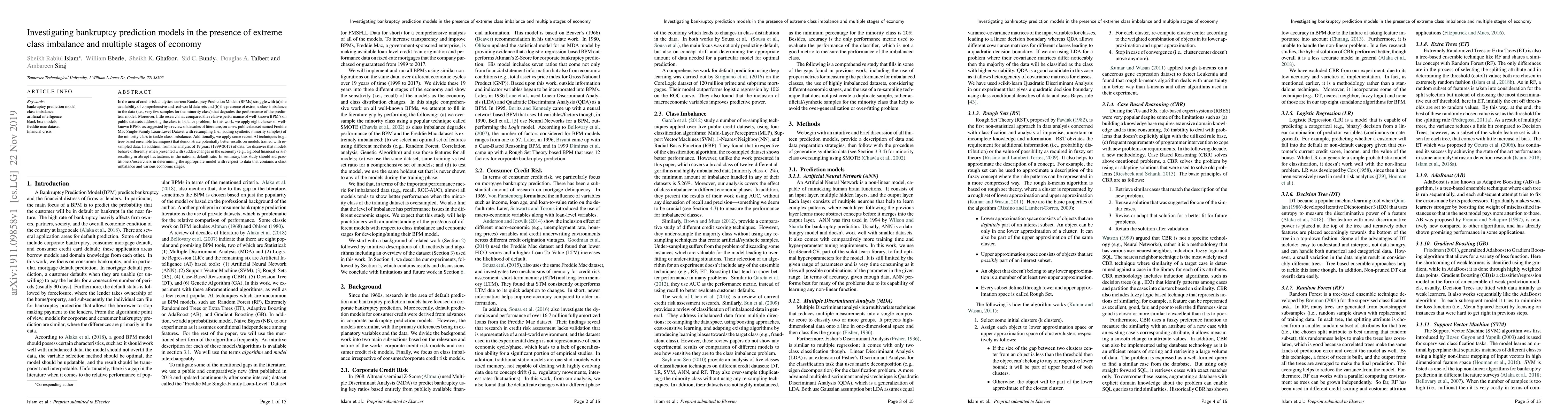In the area of credit risk analytics, current Bankruptcy Prediction Models (BPMs) struggle with (a) the availability of comprehensive and real-world data sets and (b) the presence of extreme class imbalance in the data (i.e., very few samples for the minority class) that degrades the performance of the prediction model. Moreover, little research has compared the relative performance of well-known BPM's on public datasets addressing the class imbalance problem. In this work, we apply eight classes of well-known BPMs, as suggested by a review of decades of literature, on a new public dataset named Freddie Mac Single-Family Loan-Level Dataset with resampling (i.e., adding synthetic minority samples) of the minority class to tackle class imbalance. Additionally, we apply some recent AI techniques (e.g., tree-based ensemble techniques) that demonstrate potentially better results on models trained with resampled data. In addition, from the analysis of 19 years (1999-2017) of data, we discover that models behave differently when presented with sudden changes in the economy (e.g., a global financial crisis) resulting in abrupt fluctuations in the national default rate. In summary, this study should aid practitioners/researchers in determining the appropriate model with respect to data that contains a class imbalance and various economic stages.