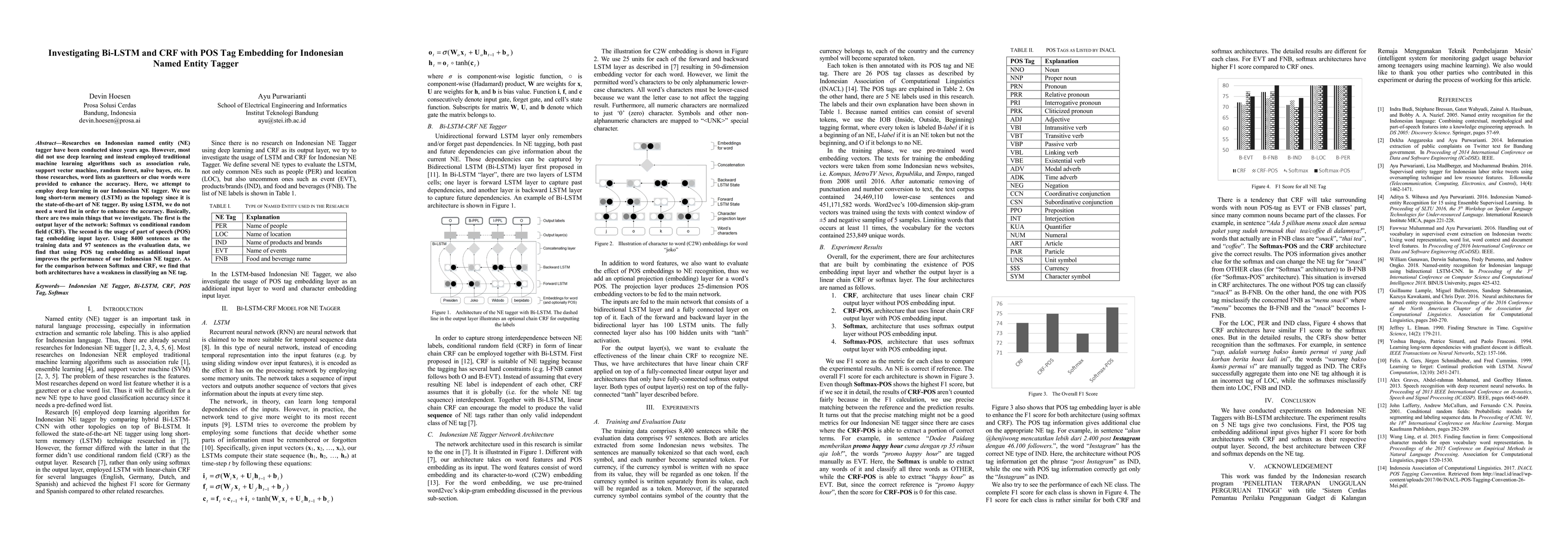 This study uses deep learning to improve an Indonesian named entity tagger, finding that POS tag embedding improves performance and both Softmax and CRF architectures have weaknesses in classifying entities.