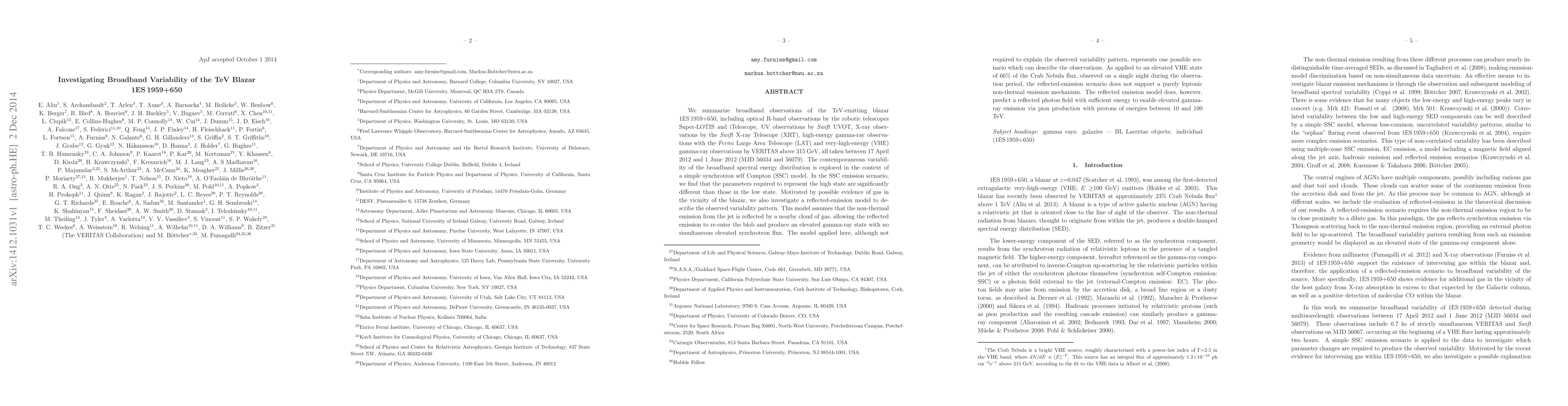 We summarize broadband observations of the TeV-emitting blazar 1ES 1959+650, including optical R-band observations by the robotic telescopes Super-LOTIS and iTelescope, UV observations by Swift UVOT, X-ray observations by the Swift X-ray Telescope (XRT), high-energy gamma-ray observations with the Fermi Large Area Telescope (LAT) and very-high-energy (VHE) gamma-ray observations by VERITAS above 315 GeV, all taken between 17 April 2012 and 1 June 2012 (MJD 56034 and 56079). The contemporaneous variability of the broadband spectral energy distribution is explored in the context of a simple synchrotron self Compton (SSC) model. In the SSC emission scenario, we find that the parameters required to represent the high state are significantly different than those in the low state. Motivated by possible evidence of gas in the vicinity of the blazar, we also investigate a reflected-emission model to describe the observed variability pattern. This model assumes that the non-thermal emission from the jet is reflected by a nearby cloud of gas, allowing the reflected emission to re-enter the blob and produce an elevated gamma-ray state with no simultaneous elevated synchrotron flux. The model applied here, although not required to explain the observed variability pattern, represents one possible scenario which can describe the observations. As applied to an elevated VHE state of 66% of the Crab Nebula flux, observed on a single night during the observation period, the reflected-emission scenario does not support a purely leptonic non-thermal emission mechanism. The reflected emission model does, however, predict a reflected photon field with sufficient energy to enable elevated gamma-ray emission via pion production with protons of energies between 10 and 100 TeV.