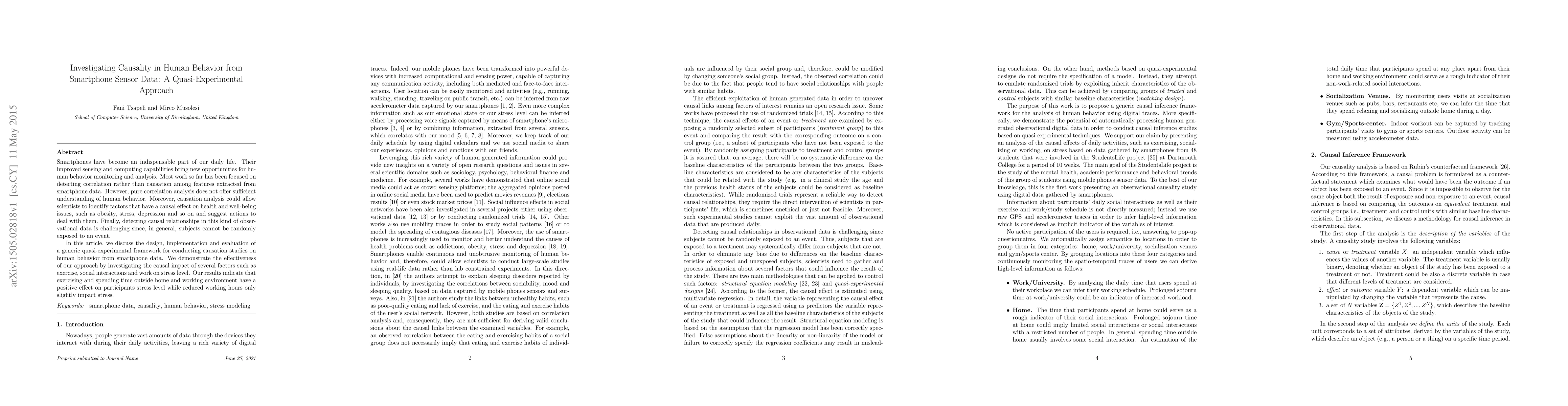 This paper proposes a quasi-experimental framework to investigate causal relationships in human behavior from smartphone sensor data, focusing on factors like exercise, social interactions, and work. The study finds that exercise and time outside home/work have a positive effect on reducing stress levels, while reduced working hours have a minimal impact.