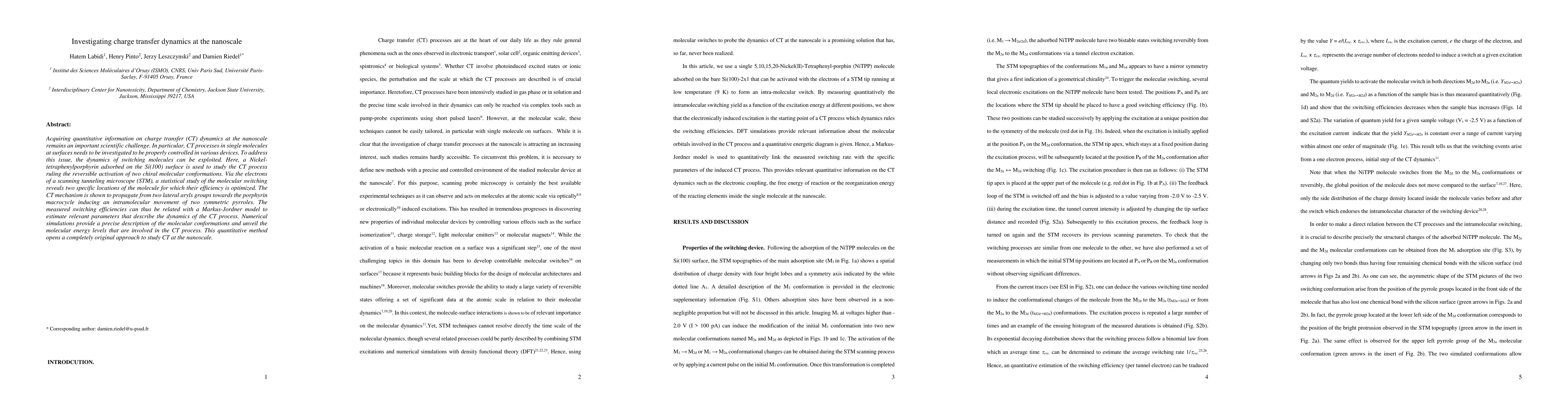 Acquiring quantitative information on charge transfer (CT) dynamics at the nanoscale remains an important scientific challenge. In particular, CT processes in single molecules at surfaces needs to be investigated to be properly controlled in various devices. To address this issue, the dynamics of switching molecules can be exploited. Here, a Nickel-tetraphenylporphyrin adsorbed on the Si(100) surface is used to study the CT process ruling the reversible activation of two chiral molecular conformations. Via the electrons of a scanning tunneling microscope (STM), a statistical study of the molecular switching reveals two specific locations of the molecule for which their efficiency is optimized. The CT mechanism is shown to propagate from two lateral aryls groups towards the porphyrin macrocycle inducing an intramolecular movement of two symmetric pyrroles. The measured switching efficiencies can thus be related with a Markus-Jordner model to estimate relevant parameters that describe the dynamics of the CT process. Numerical simulations provide a precise description of the molecular conformations and unveil the molecular energy levels that are involved in the CT process. This quantitative method opens a completely original approach to study CT at the nanoscale.