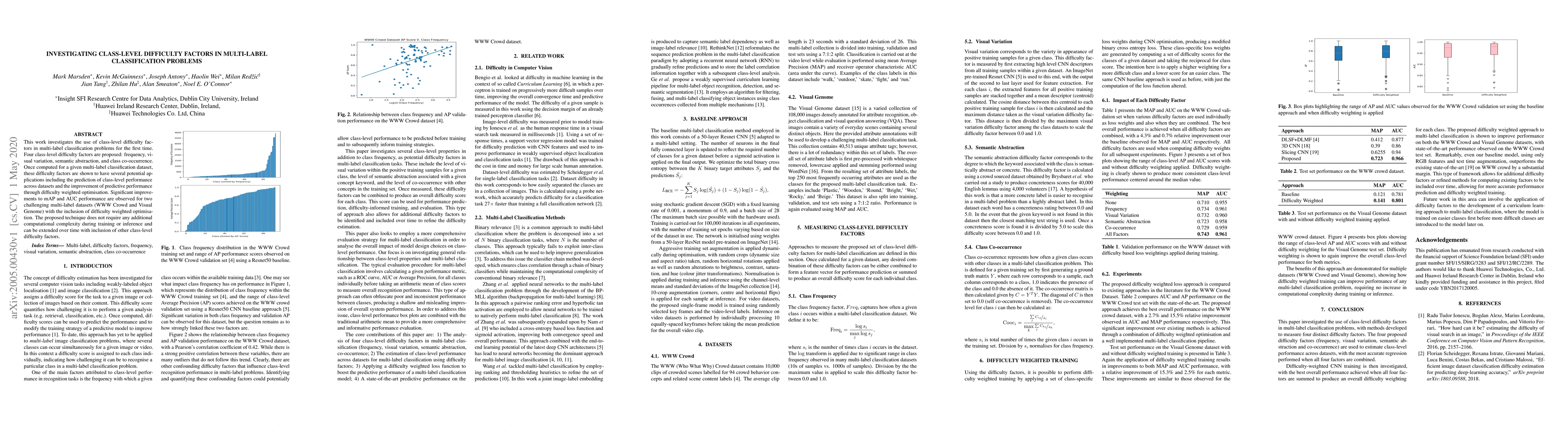 This paper introduces four class-level difficulty factors—frequency, visual variation, semantic abstraction, and class co-occurrence—to enhance multi-label classification. The proposed factors improve predictive performance and prediction across datasets without additional computational costs.