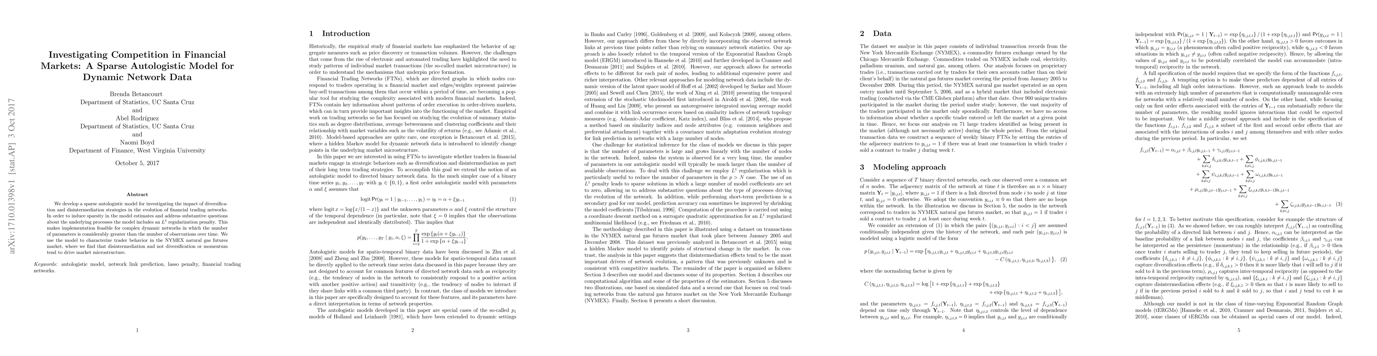 This paper develops a sparse autologistic model with an $L^1$ regularization to study diversification and disintermediation in financial trading networks. The model is applied to NYMEX natural gas futures, revealing that disintermediation significantly influences market microstructure rather than diversification or momentum.
