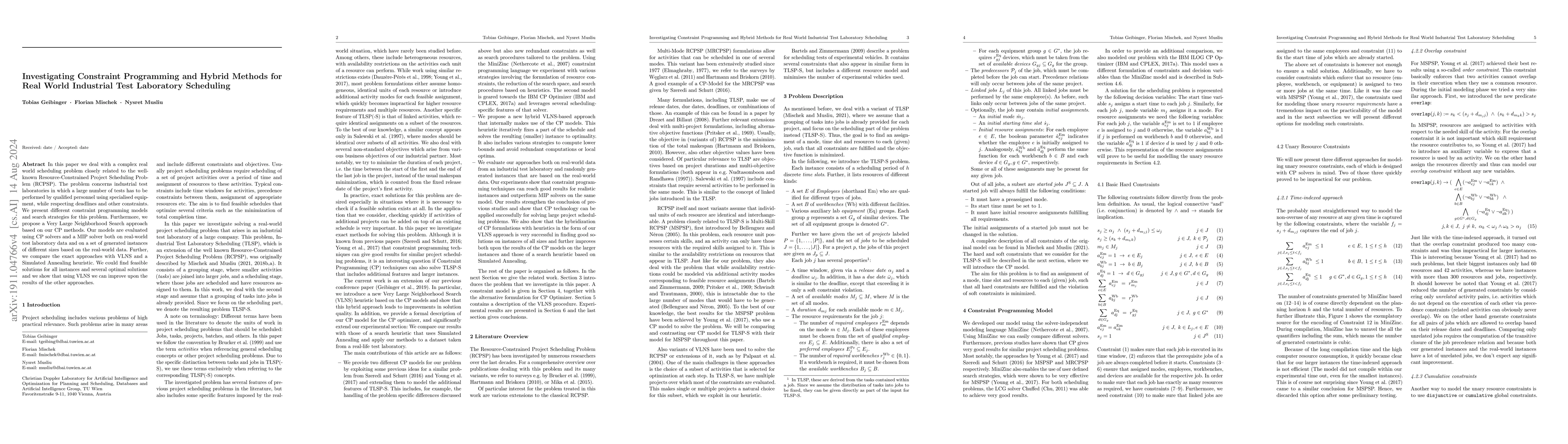This paper investigates constraint programming and hybrid methods, including Very Large Neighborhood Search (VLNS), for scheduling tests in industrial laboratories. The study compares the effectiveness of these methods on real-world data and generated instances, demonstrating that VLNS often yields better results than constraint programming and other heuristic approaches.