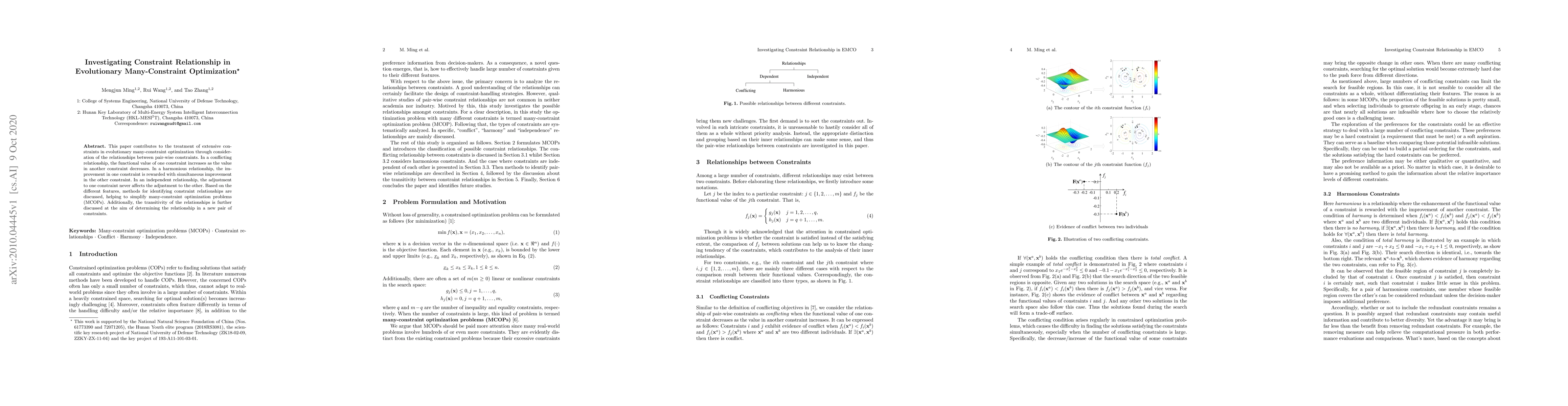 This paper contributes to the treatment of extensive constraints in evolutionary many-constraint optimization through consideration of the relationships between pair-wise constraints. In a conflicting relationship, the functional value of one constraint increases as the value in another constraint decreases. In a harmonious relationship, the improvement in one constraint is rewarded with simultaneous improvement in the other constraint. In an independent relationship, the adjustment to one constraint never affects the adjustment to the other. Based on the different features, methods for identifying constraint relationships are discussed, helping to simplify many-constraint optimization problems (MCOPs). Additionally, the transitivity of the relationships is further discussed at the aim of determining the relationship in a new pair of constraints.