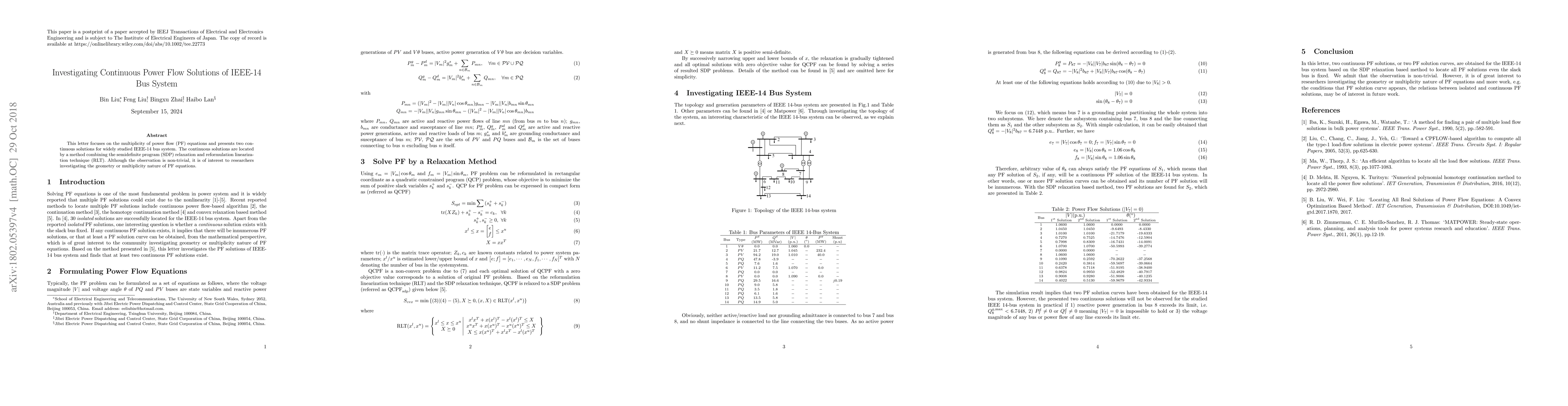 Researchers found two continuous power flow solutions for the IEEE-14 bus system using a method combining semidefinite programs and reformulation linearization technique. This discovery highlights the complexity of power flow equations and has implications for understanding their geometry and multiplicity.
