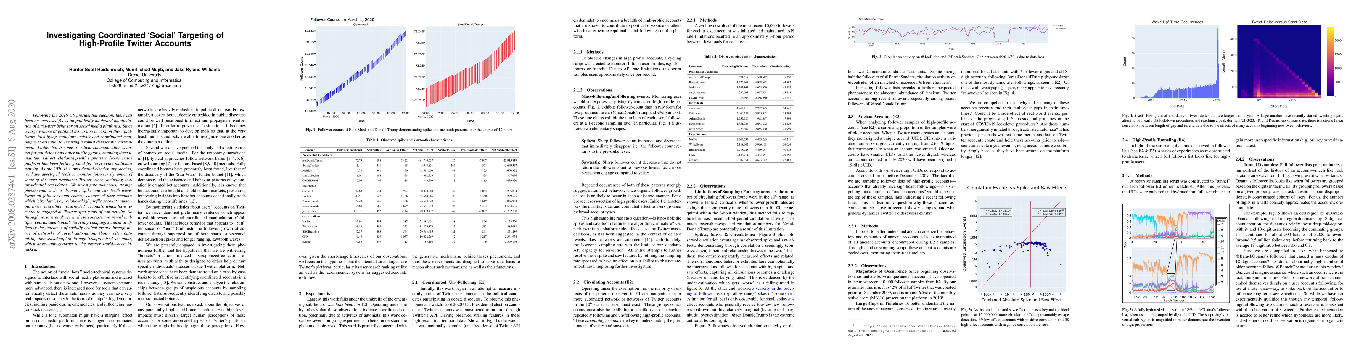 Following the 2016 US presidential election, there has been an increased focus on politically-motivated manipulation of mass-user behavior on social media platforms. Since a large volume of political discussion occurs on these platforms, identifying malicious activity and coordinated campaigns is essential to ensuring a robust democratic environment. Twitter has become a critical communication channel for politicians and other public figures, enabling them to maintain a direct relationship with supporters. However, the platform has been fertile ground for large-scale malicious activity. As the 2020 U.S. presidential election approaches, we have developed tools to monitor follower dynamics of some of the most prominent Twitter users, including U.S. presidential candidates. We investigate numerous, strange phenomena, such as dramatic spike and saw-tooth waveforms on follower-count charts; cohorts of user accounts which 'circulate', i.e., re-follow high profile accounts numerous times; and other 'resurrected' accounts, which have recently re-engaged on Twitter after years of non-activity. So through various analyses in these contexts, we reveal multiple, coordinated 'social' targeting campaigns aimed at affecting the outcomes of socially critical events through the use of networks of social automations (bots), often optimizing their social capital through 'compromised' accounts, which have--unbeknownst to the greater world--been hijacked.