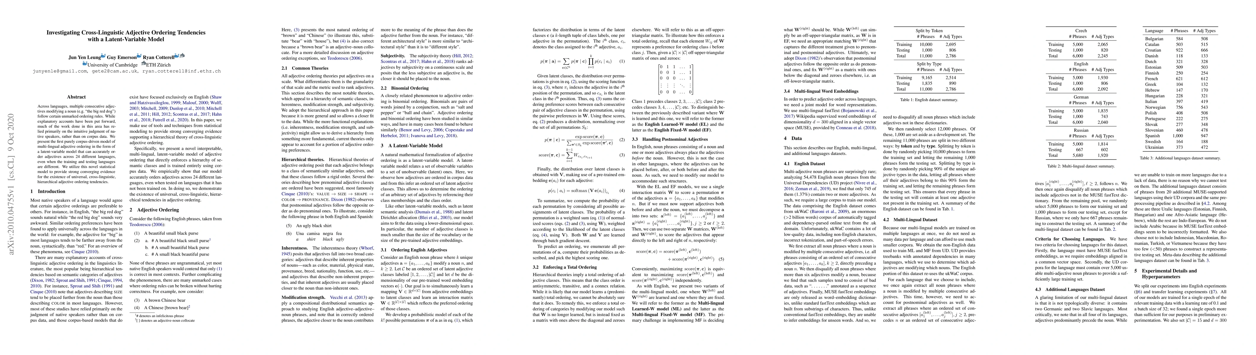 This study develops a latent-variable model to analyze and predict cross-linguistic adjective ordering across 24 languages using corpus data, providing strong evidence for universal, hierarchical tendencies in adjective placement regardless of language.