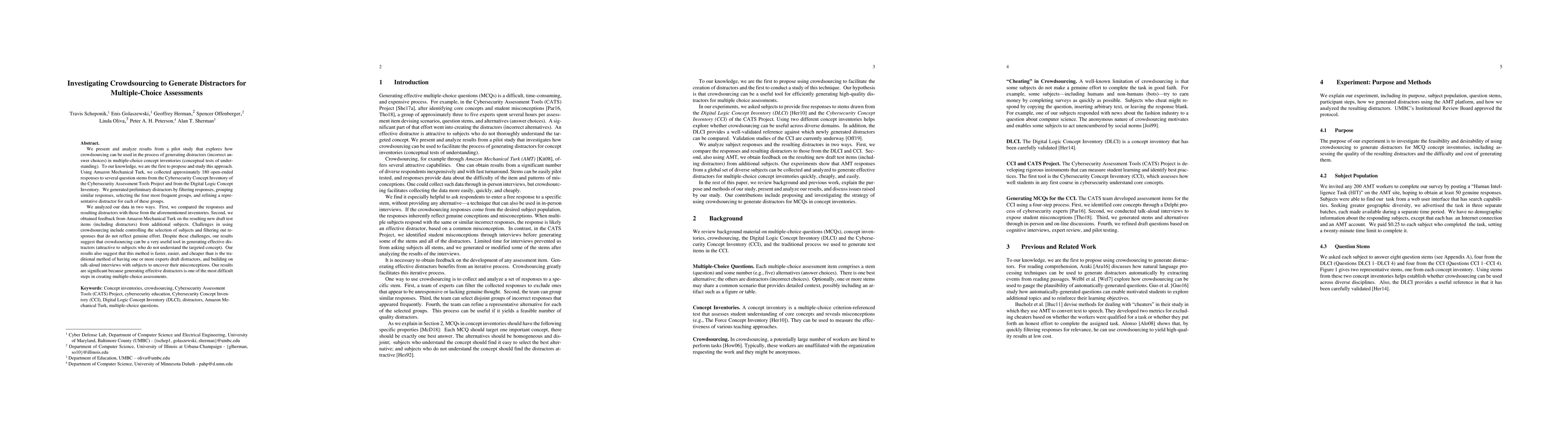 This study explores using crowdsourcing via Amazon Mechanical Turk to generate distractors for multiple-choice assessments, finding it faster, cheaper, and effective compared to traditional expert-drafting methods. Despite challenges in controlling subject selection and filtering responses, the method holds promise for simplifying the generation of effective distractors.