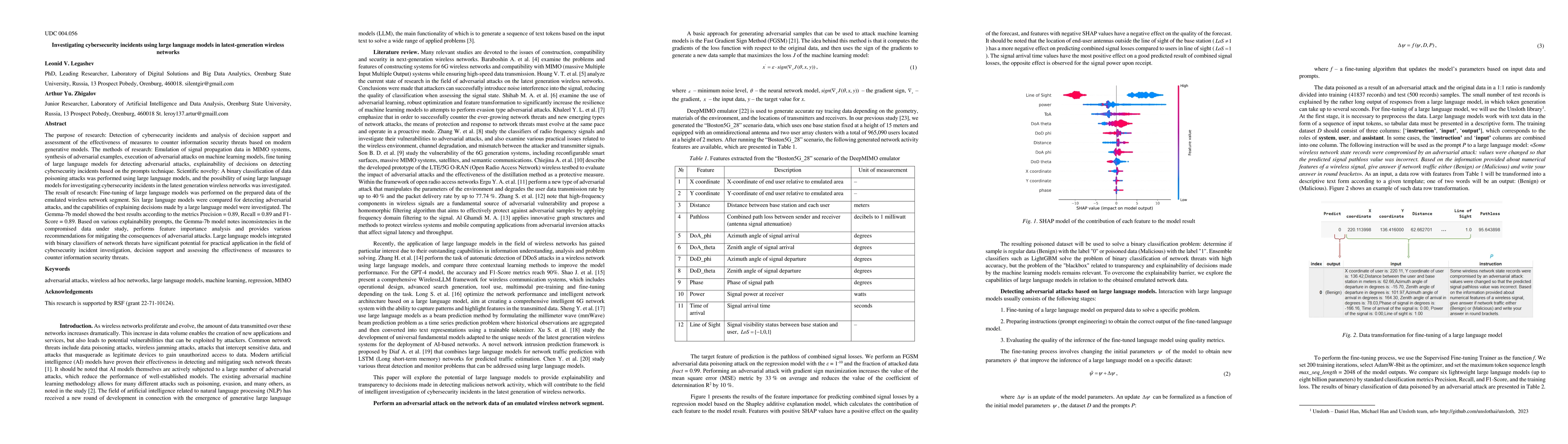 The purpose of research: Detection of cybersecurity incidents and analysis of decision support and assessment of the effectiveness of measures to counter information security threats based on modern generative models. The methods of research: Emulation of signal propagation data in MIMO systems, synthesis of adversarial examples, execution of adversarial attacks on machine learning models, fine tuning of large language models for detecting adversarial attacks, explainability of decisions on detecting cybersecurity incidents based on the prompts technique. Scientific novelty: A binary classification of data poisoning attacks was performed using large language models, and the possibility of using large language models for investigating cybersecurity incidents in the latest generation wireless networks was investigated. The result of research: Fine-tuning of large language models was performed on the prepared data of the emulated wireless network segment. Six large language models were compared for detecting adversarial attacks, and the capabilities of explaining decisions made by a large language model were investigated. The Gemma-7b model showed the best results according to the metrics Precision = 0.89, Recall = 0.89 and F1-Score = 0.89. Based on various explainability prompts, the Gemma-7b model notes inconsistencies in the compromised data under study, performs feature importance analysis and provides various recommendations for mitigating the consequences of adversarial attacks. Large language models integrated with binary classifiers of network threats have significant potential for practical application in the field of cybersecurity incident investigation, decision support and assessing the effectiveness of measures to counter information security threats.