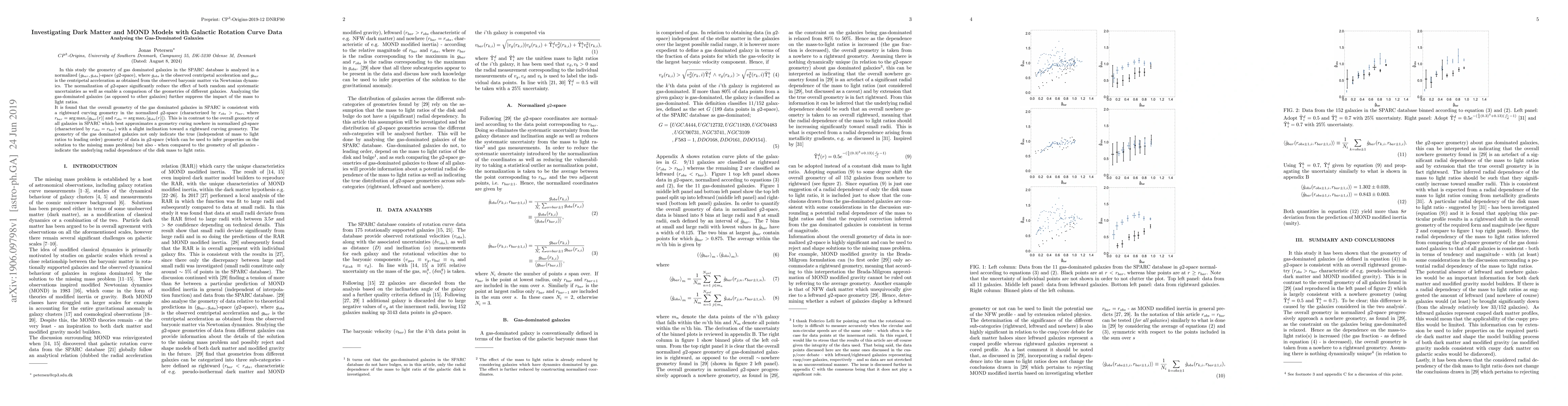 Researchers analyzed galaxy rotation curves to investigate dark matter and MOND models, finding that gas-dominated galaxies follow a consistent rightward curving geometry, while other galaxies show no such pattern.
