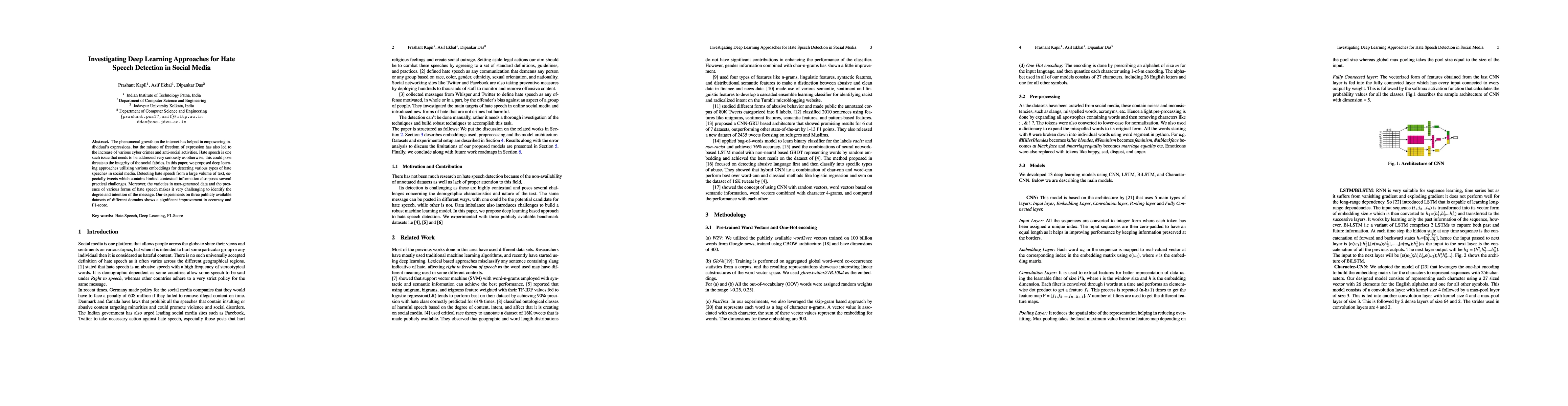 This paper proposes deep learning methods using various embeddings to detect hate speech in social media, addressing the challenges posed by the limited context and diverse forms of hate speech. Experiments on three datasets show significant improvements in accuracy and F1-score.