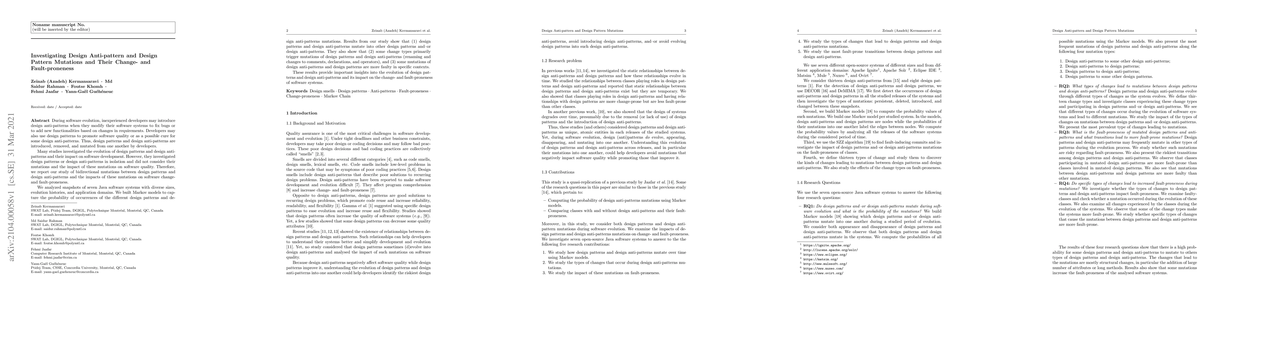 This study investigates how design patterns and anti-patterns mutate into each other during software evolution and their impact on software change- and fault-proneness. Findings reveal that certain mutations are more likely to occur and that some mutations are more likely to introduce faults, providing insights into the evolution of design quality in software systems.