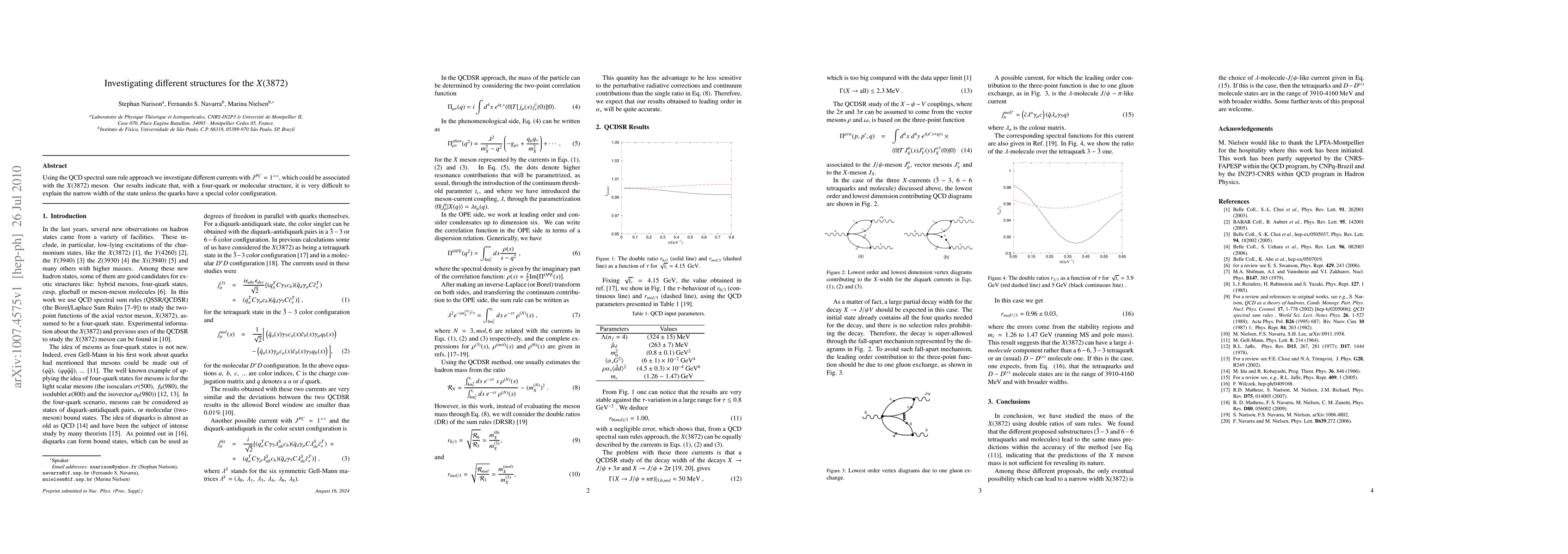 Using the QCD spectral sum rule approach we investigate different currents with $J^{PC}=1^{++}$, which could be associated with the $X(3872)$ meson. Our results indicate that, with a four-quark or molecular structure, it is very difficult to explain the narrow width of the state unless the quarks have a special color configuration.
