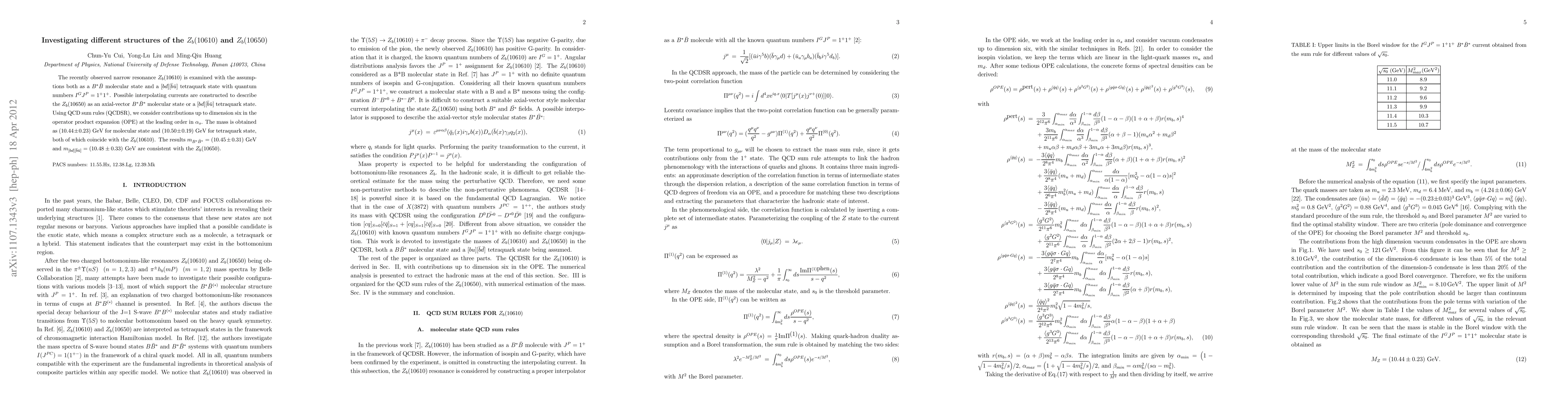 The recently observed narrow resonance $Z_{b}(10610)$ is examined with the assumptions both as a $B^{*}\bar{B}$ molecular state and a $[bd][\bar{b}\bar{u}]$ tetraquark state with quantum numbers $I^{G}J^{P}=1^{+}1^{+}$. Possible interpolating currents are constructed to describe the $Z_{b}(10650)$ as an axial-vector $B^{*}\bar{B}^{*}$ molecular state or a $[bd][\bar{b}\bar{u}]$ tetraquark state. Using QCD sum rules (QCDSR), we consider contributions up to dimension six in the operator product expansion (OPE) at the leading order in $\alpha_{s}$. The mass is obtained as $(10.44\pm0.23) GeV$ for molecular state and $(10.50\pm0.19) GeV$ for tetraquark state, both of which coincide with the $Z_{b}(10610)$. The results $m_{B^{*}\bar{B}^{*}}=(10.45\pm0.31) GeV$ and $m_{[bd][\bar{b}\bar{u}]}=(10.48\pm0.33) GeV$ are consistent with the $Z_{b}(10650)$.