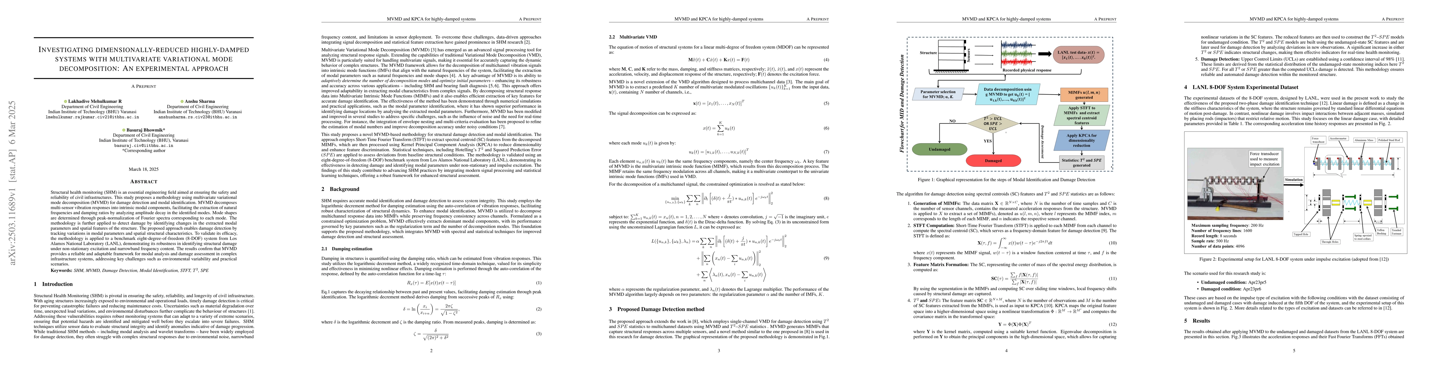 The main technical contribution is the application of multivariate variational mode decomposition (MVMD) for dimensionally-reduced, highly-damped systems in structural health monitoring, facilitating damage detection and modal identification.
