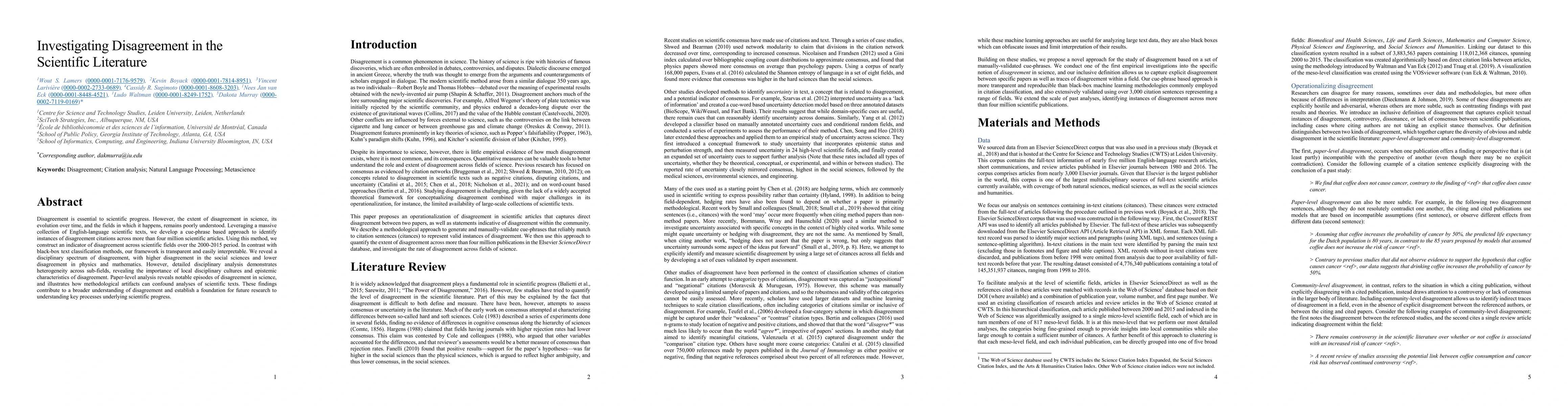Disagreement is essential to scientific progress. However, the extent of disagreement in science, its evolution over time, and the fields in which it happens, remains poorly understood. Leveraging a massive collection of English-language scientific texts, we develop a cue-phrase based approach to identify instances of disagreement citations across more than four million scientific articles. Using this method, we construct an indicator of disagreement across scientific fields over the 2000-2015 period. In contrast with black-box text classification methods, our framework is transparent and easily interpretable. We reveal a disciplinary spectrum of disagreement, with higher disagreement in the social sciences and lower disagreement in physics and mathematics. However, detailed disciplinary analysis demonstrates heterogeneity across sub-fields, revealing the importance of local disciplinary cultures and epistemic characteristics of disagreement. Paper-level analysis reveals notable episodes of disagreement in science, and illustrates how methodological artifacts can confound analyses of scientific texts. These findings contribute to a broader understanding of disagreement and establish a foundation for future research to understanding key processes underlying scientific progress.